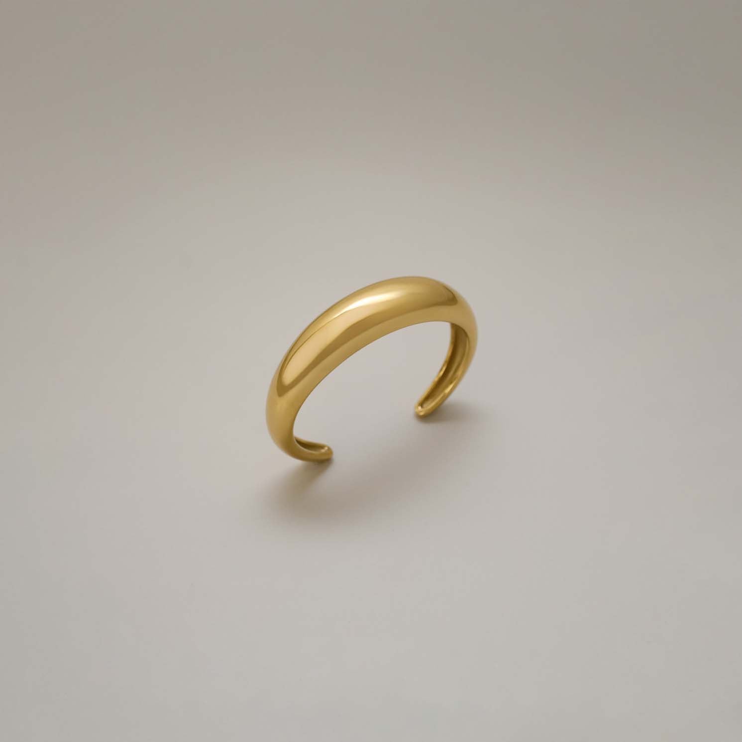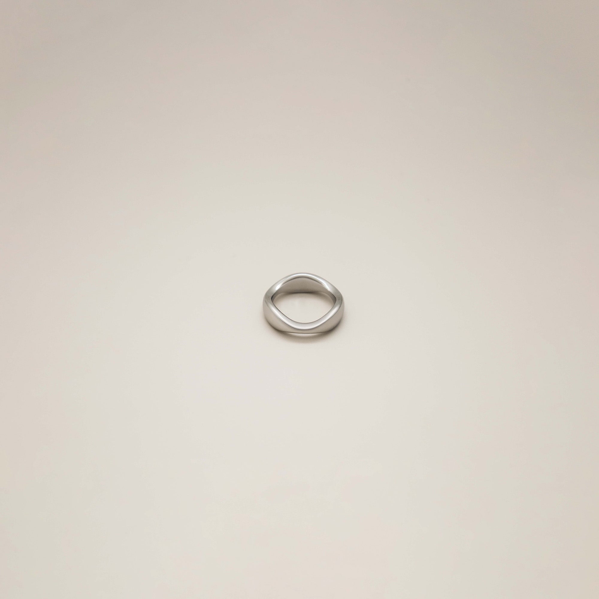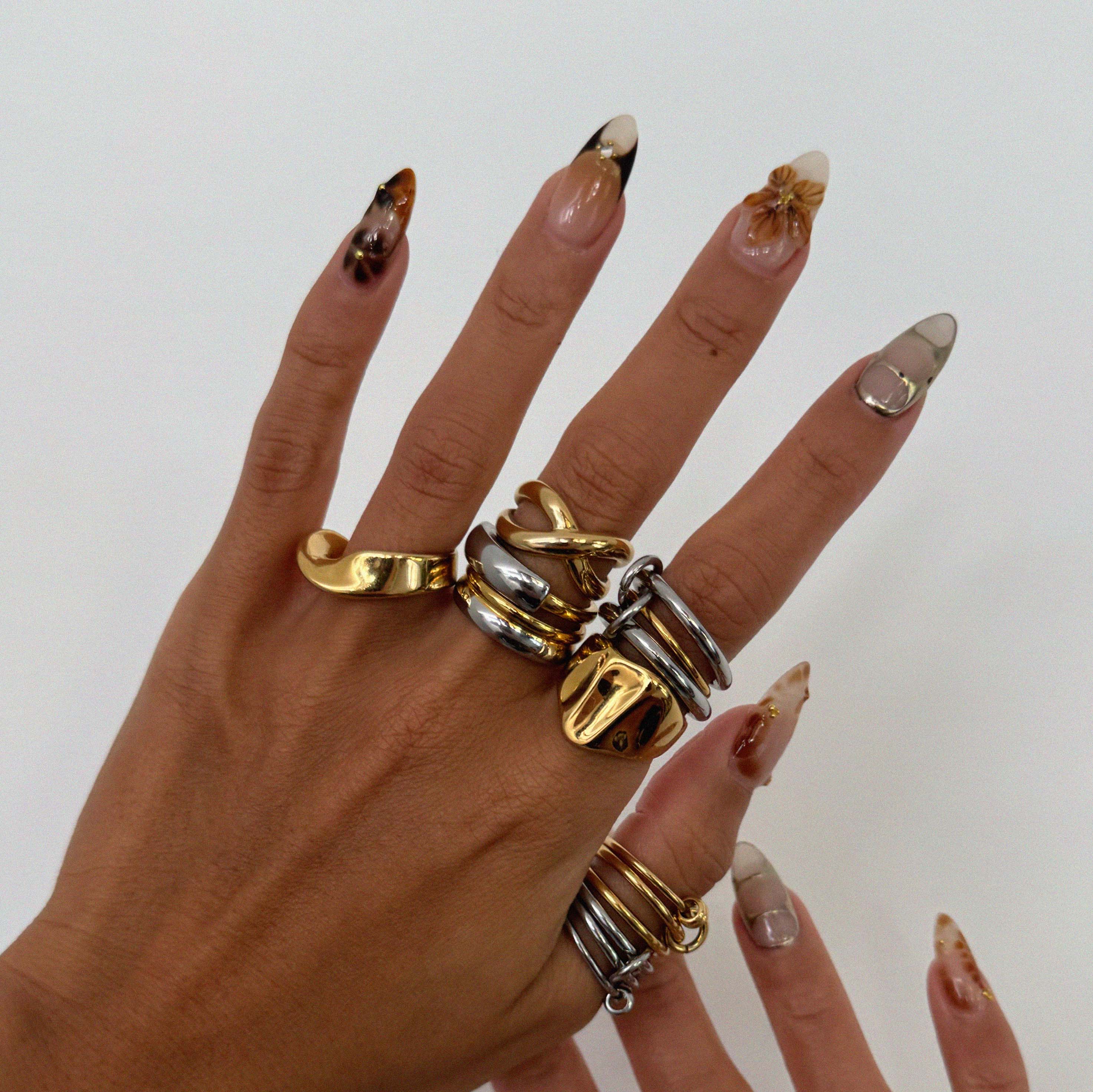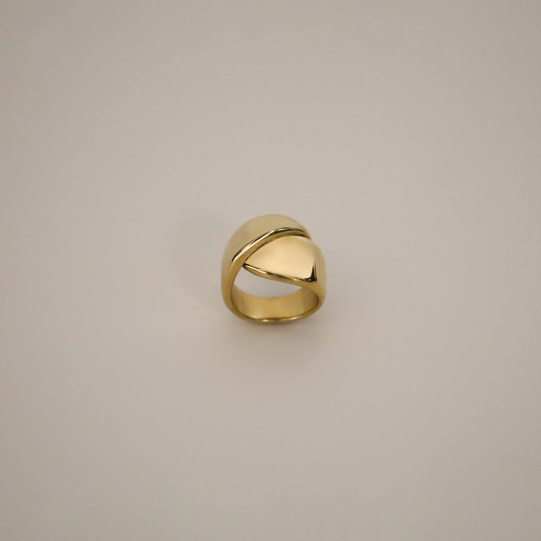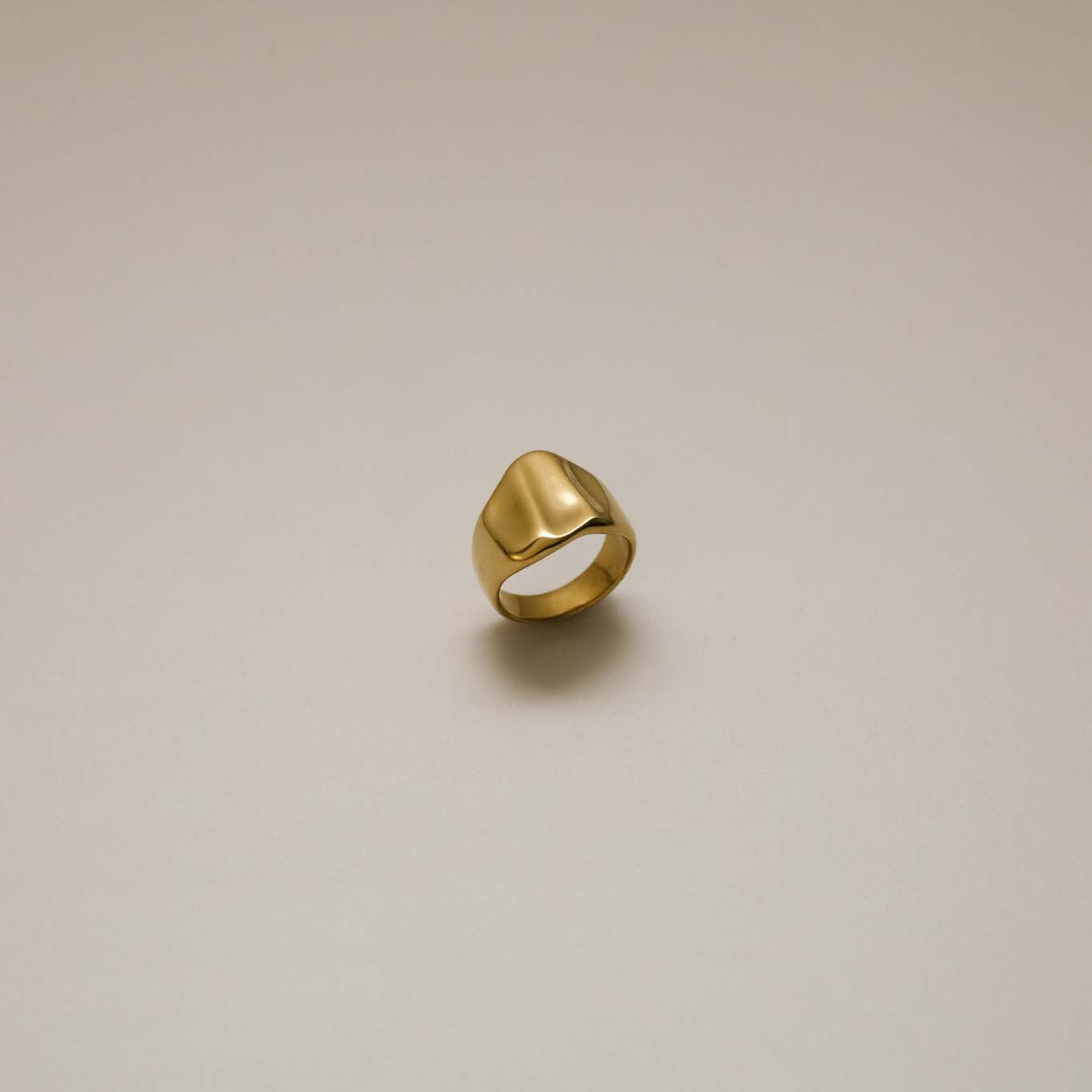 A bold, sculpted form with a smooth dome centre framed by a soft oval contour. Designed in a two-tone finish of gold and silver, it offers a modern take on a classic signet style. Available now in sizes 6, 7 & 8.