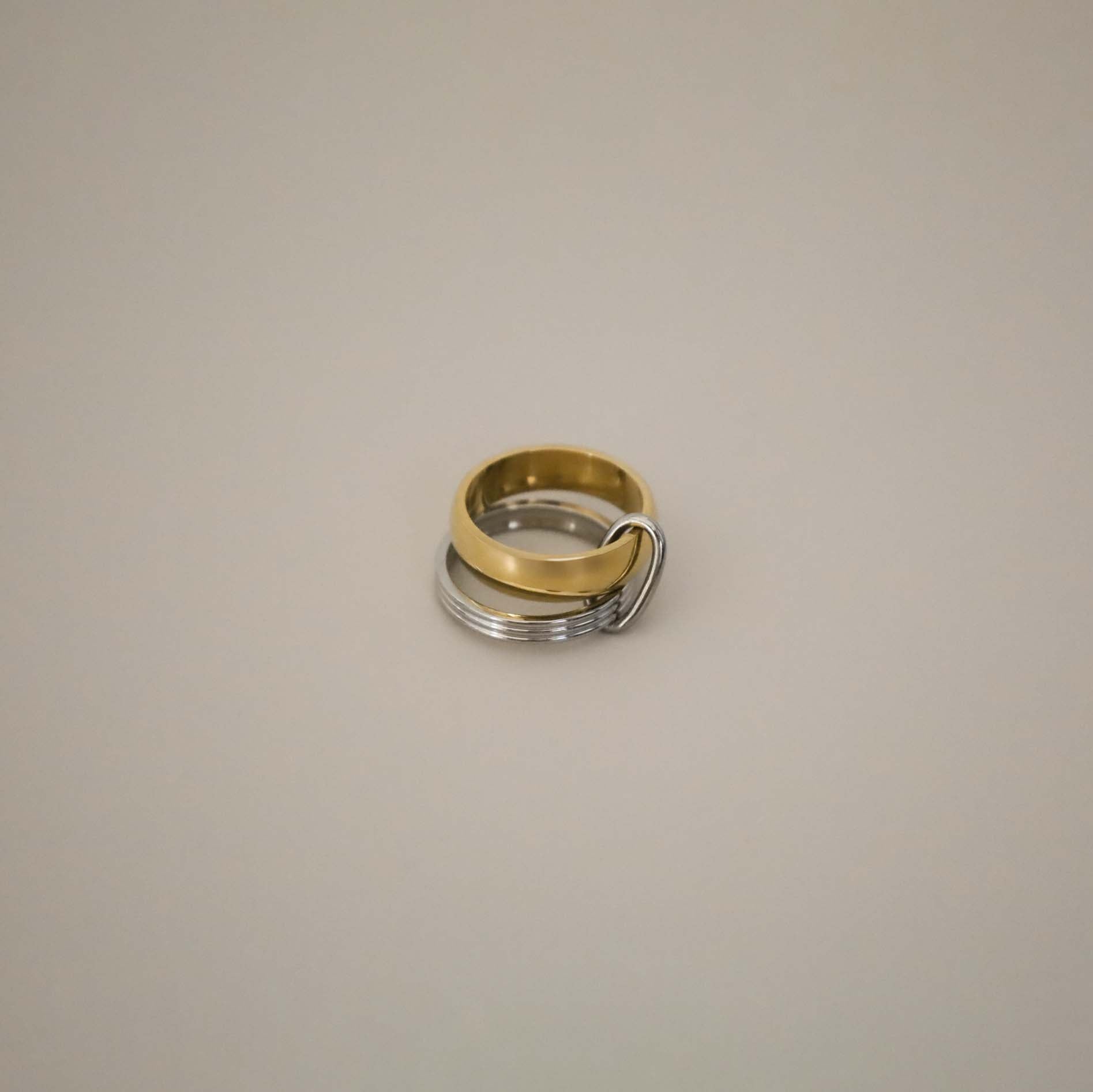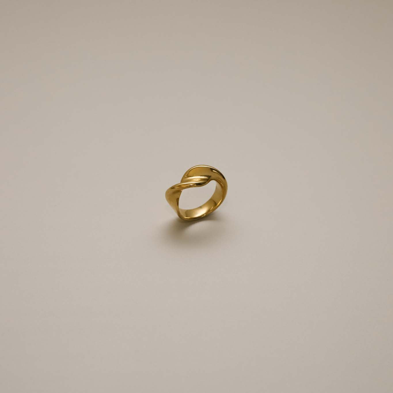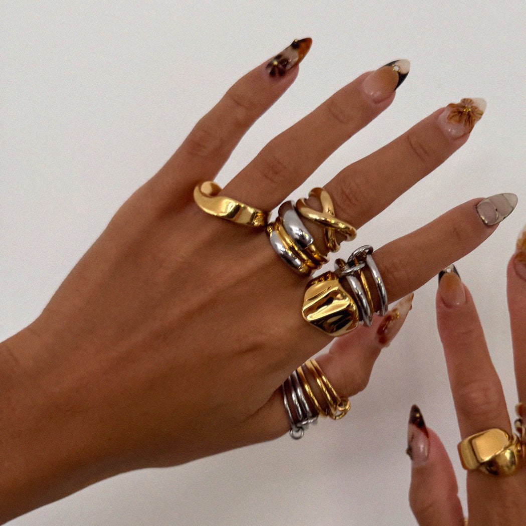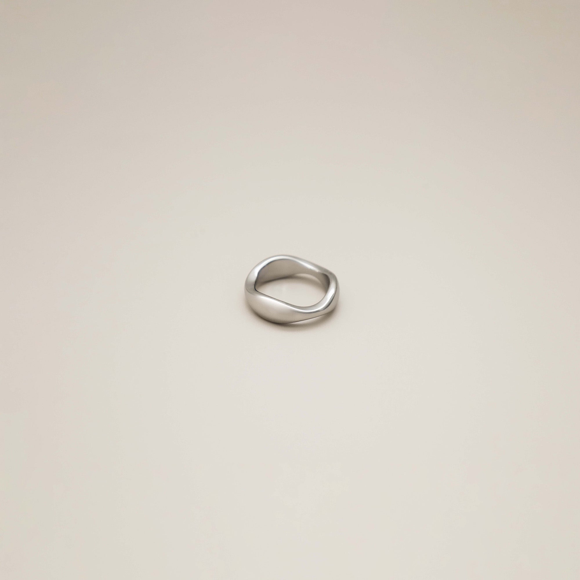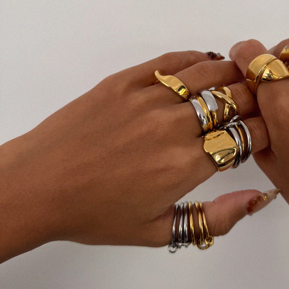 A bold, sculpted form with a smooth dome centre framed by a soft oval contour. Designed in a two-tone finish of gold and silver, it offers a modern take on a classic signet style. Available now in sizes 6, 7 & 8.