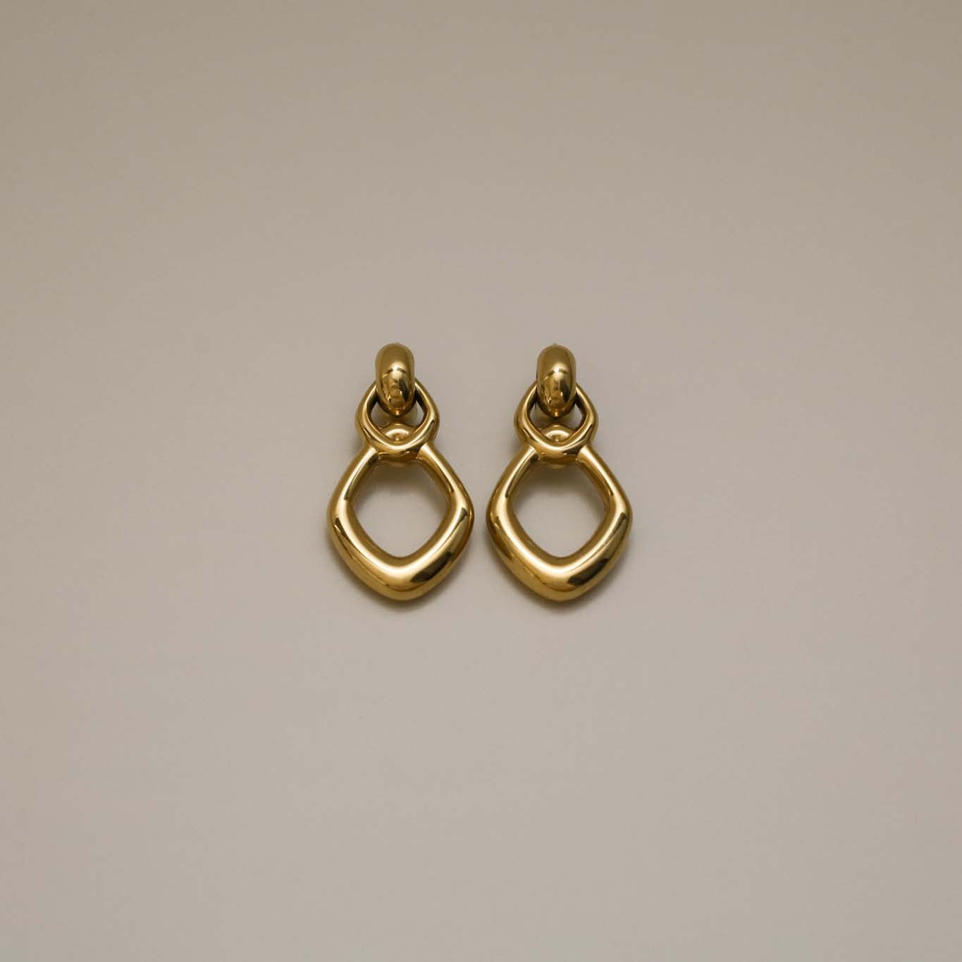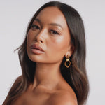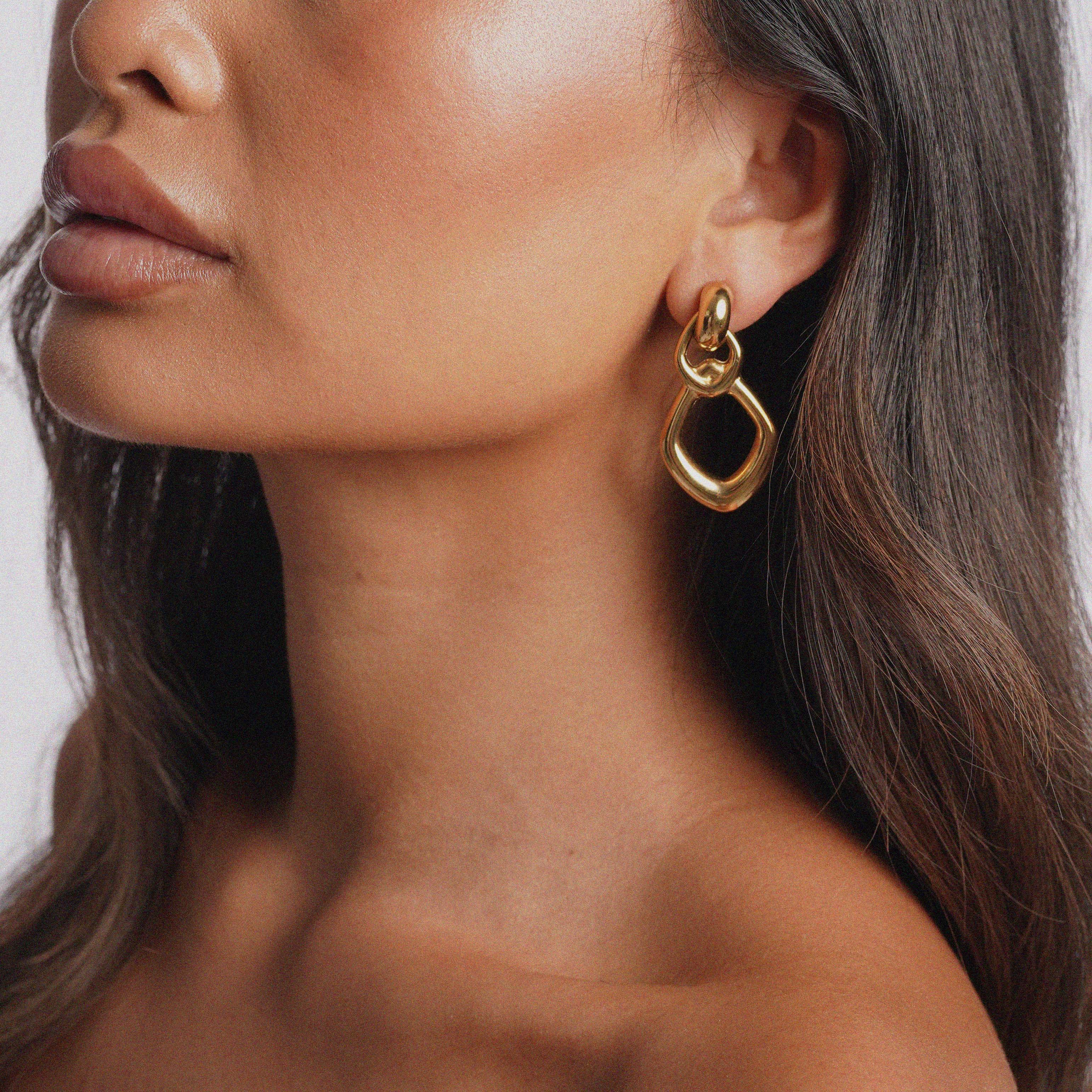 The Ekre Earrings feature a bold, sculptural design with smooth, rounded edges and an open geometric shape. Crafted in 18K Gold Plated Stainless Steel, they dangle elegantly from a stud, creating subtle movement with every step. Lightweight and refined, the Ekre Earrings are an effortless way to elevate both everyday and occasion looks.