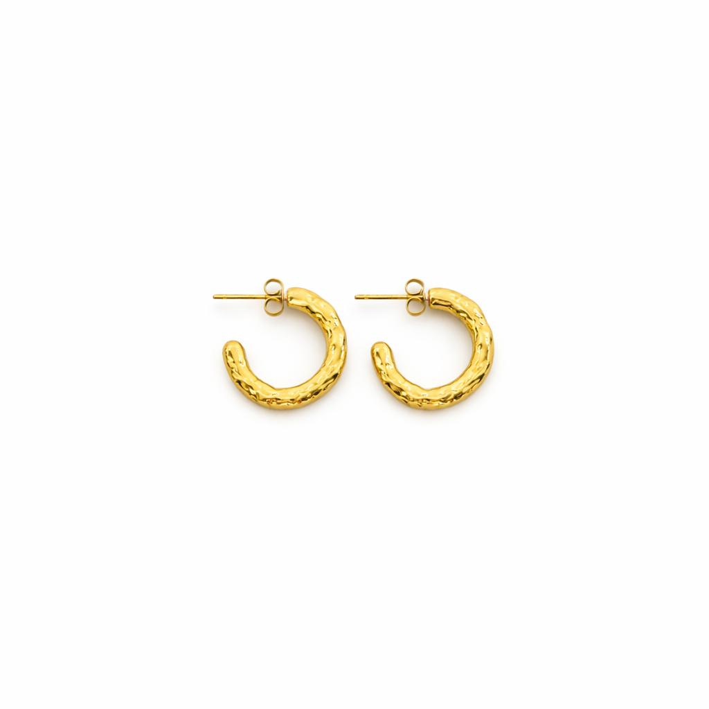 The Elki Gold Earrings are a mini gold hoop with a rippled, hammered texture that wraps around the entire form. The texture catches the light in that warm, uneven way that a smooth hoop simply cannot, giving a small earring a lot more character than its size suggests. A subtle upgrade on the classic everyday hoop.