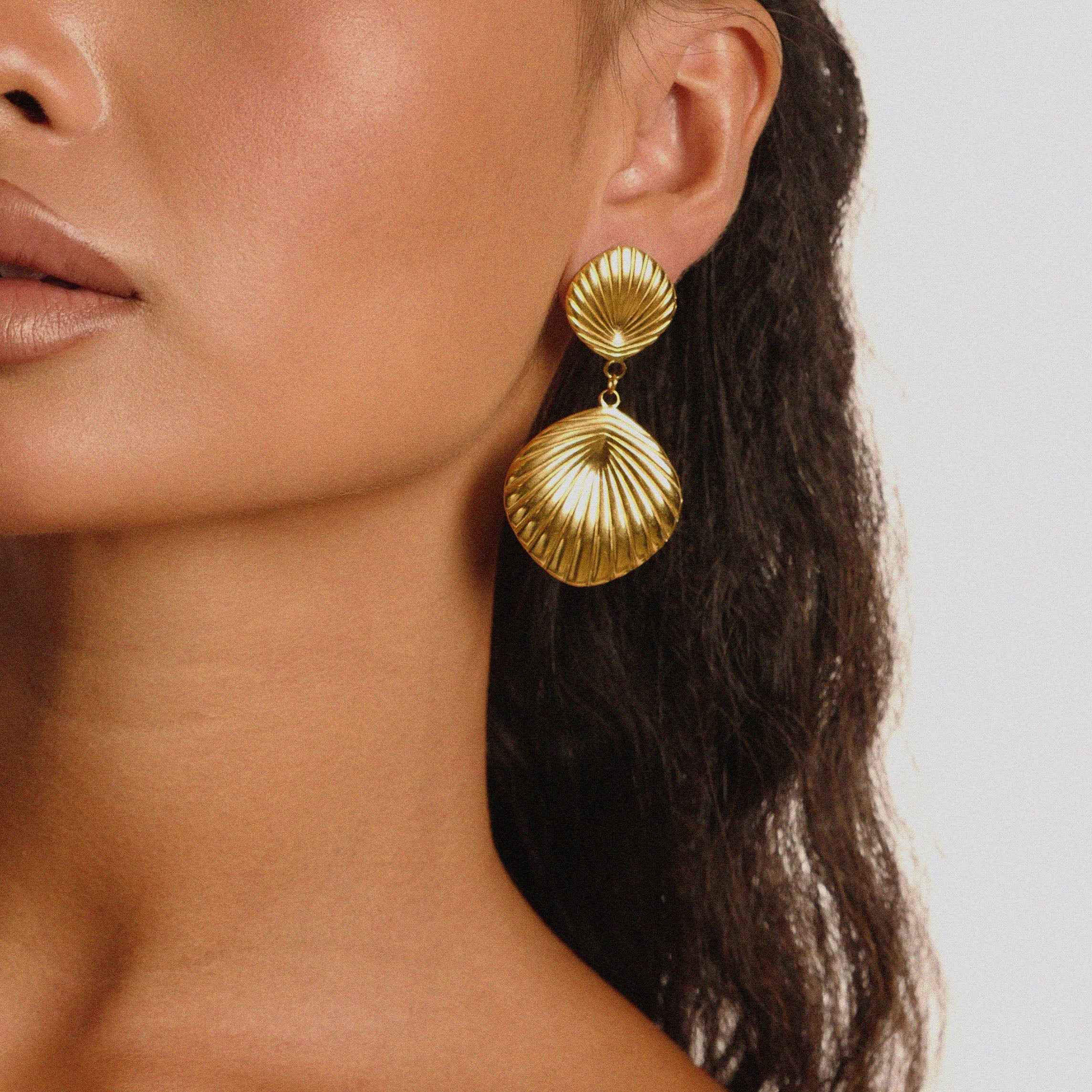 The Ellore Earrings have been designed with a double shell silhouette, featuring two graduated scallop shapes connected with a subtle hinge. Their tiered design creates movement while keeping a clean, structured feel. A bold yet versatile piece, they’re an easy way to bring a refined statement to any look & are perfect for those special occasions.