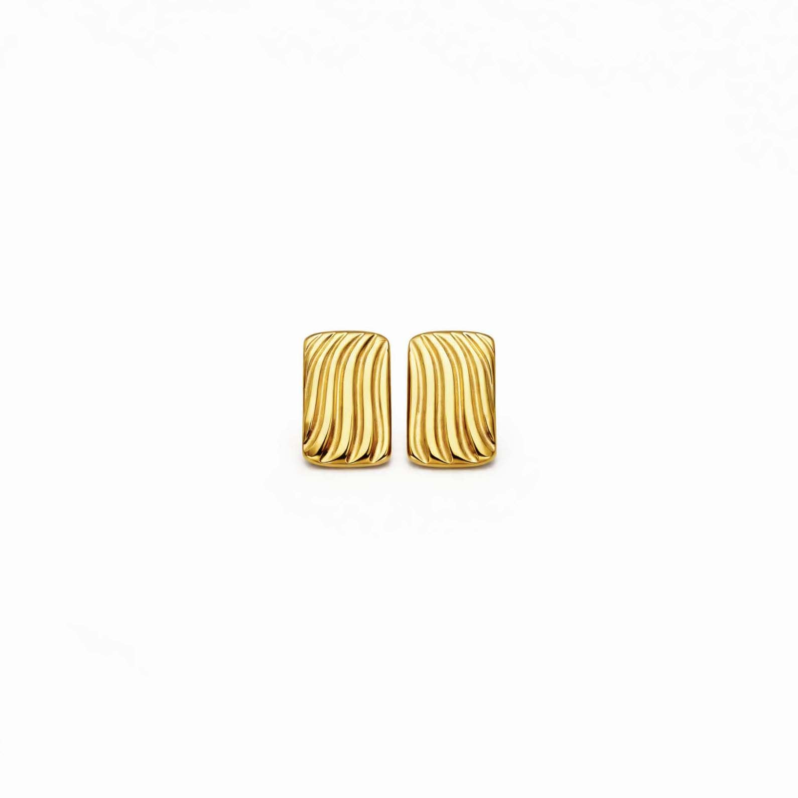 The Elois Earring is a bold, rectangular statement piece with a ripple, wave-like textured design that catches the light. A standout piece that remains effortless to style.