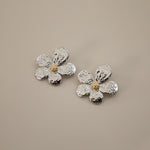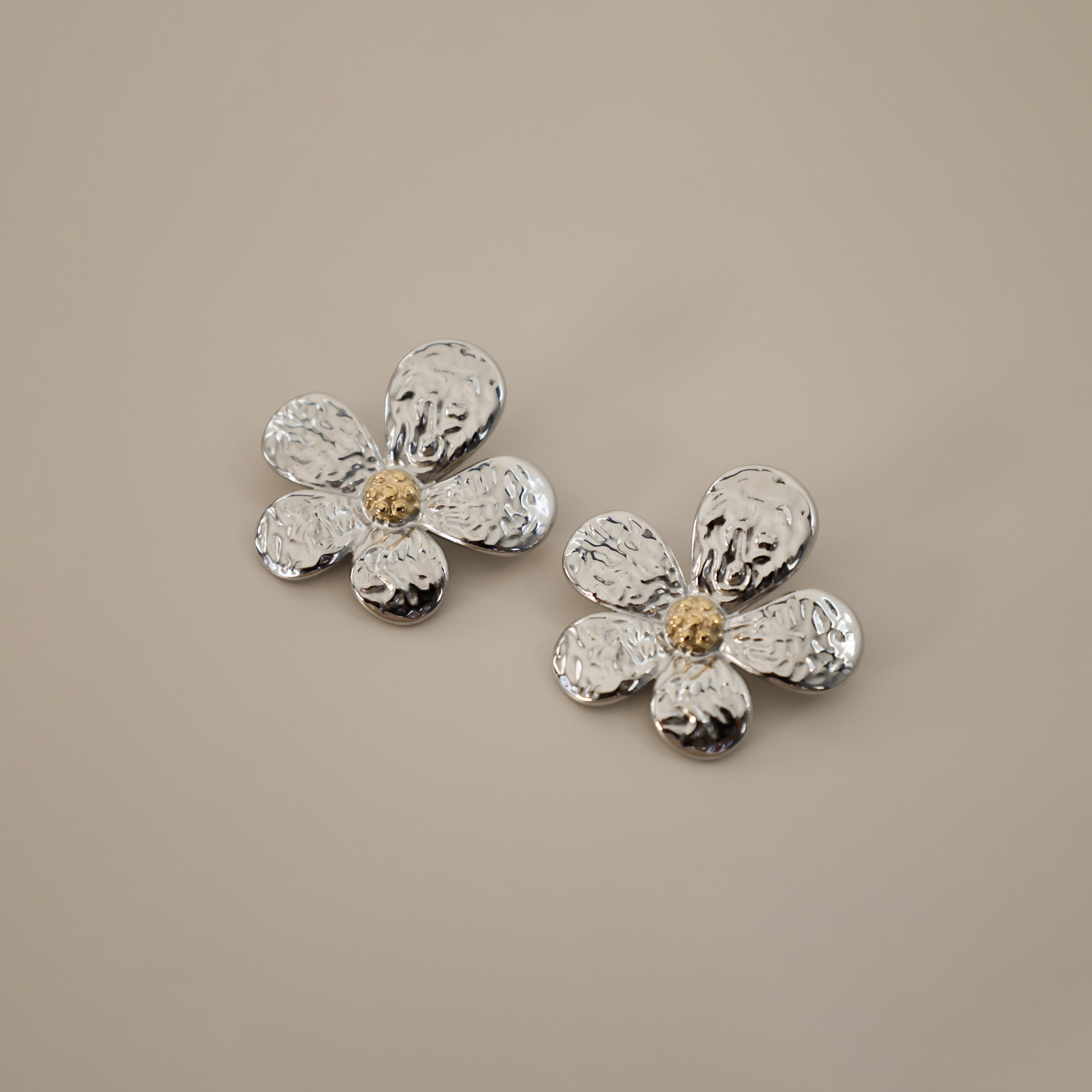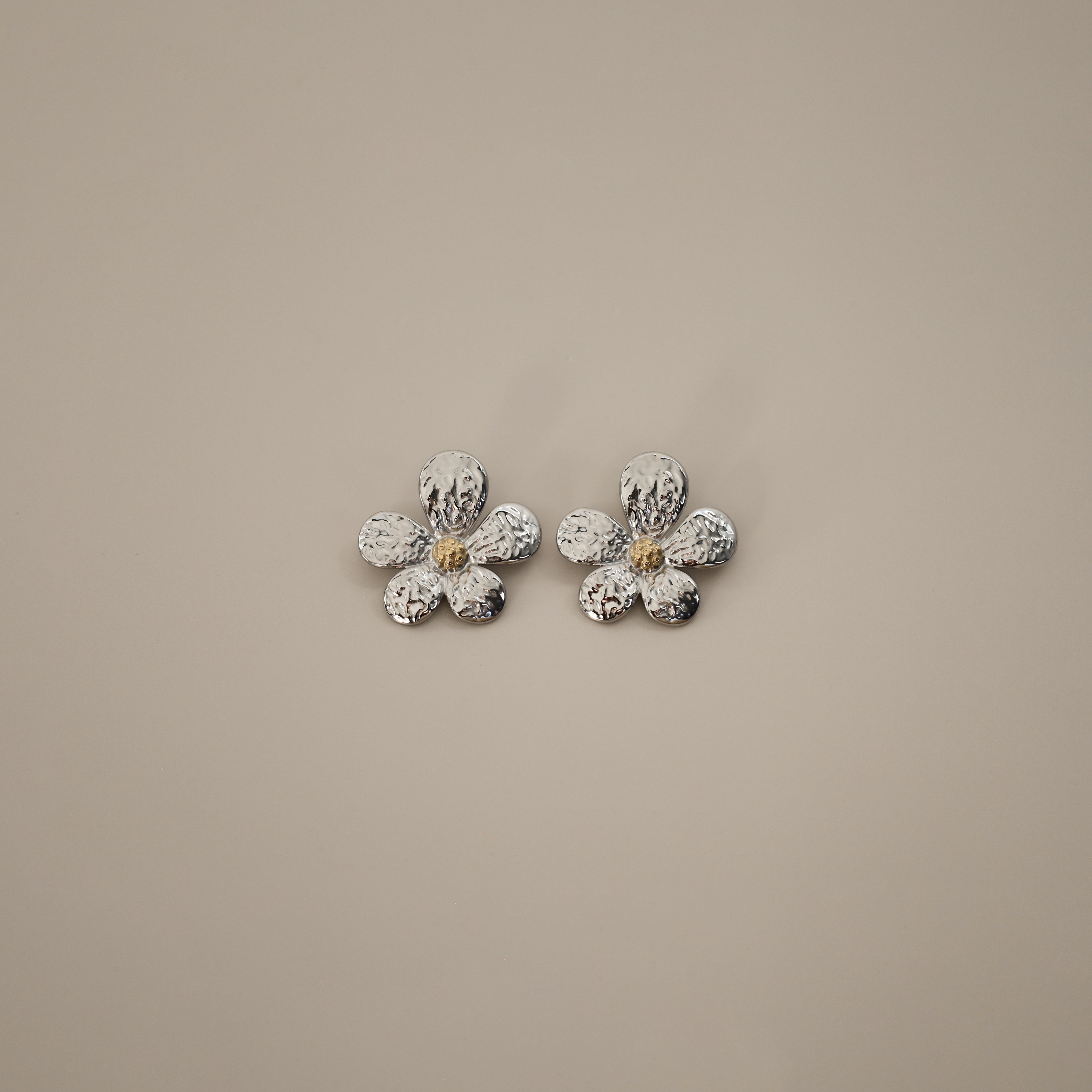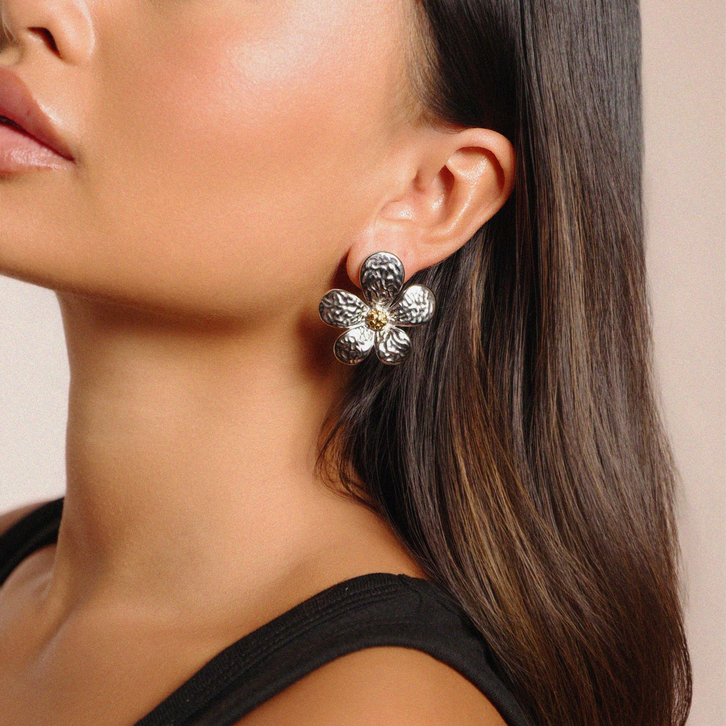 The Elsabbe Earring is a delicate floral design with hammered petals and a subtle golden center. With its two tone design, these earrings are the perfect introduction to mixing metals. The Elsabbe Earring is a perfect choice for summer, adding a fresh and radiant touch to your warm-weather outfits. Ideal for both casual outings and special occasions, it’s a timeless accessory for the season.