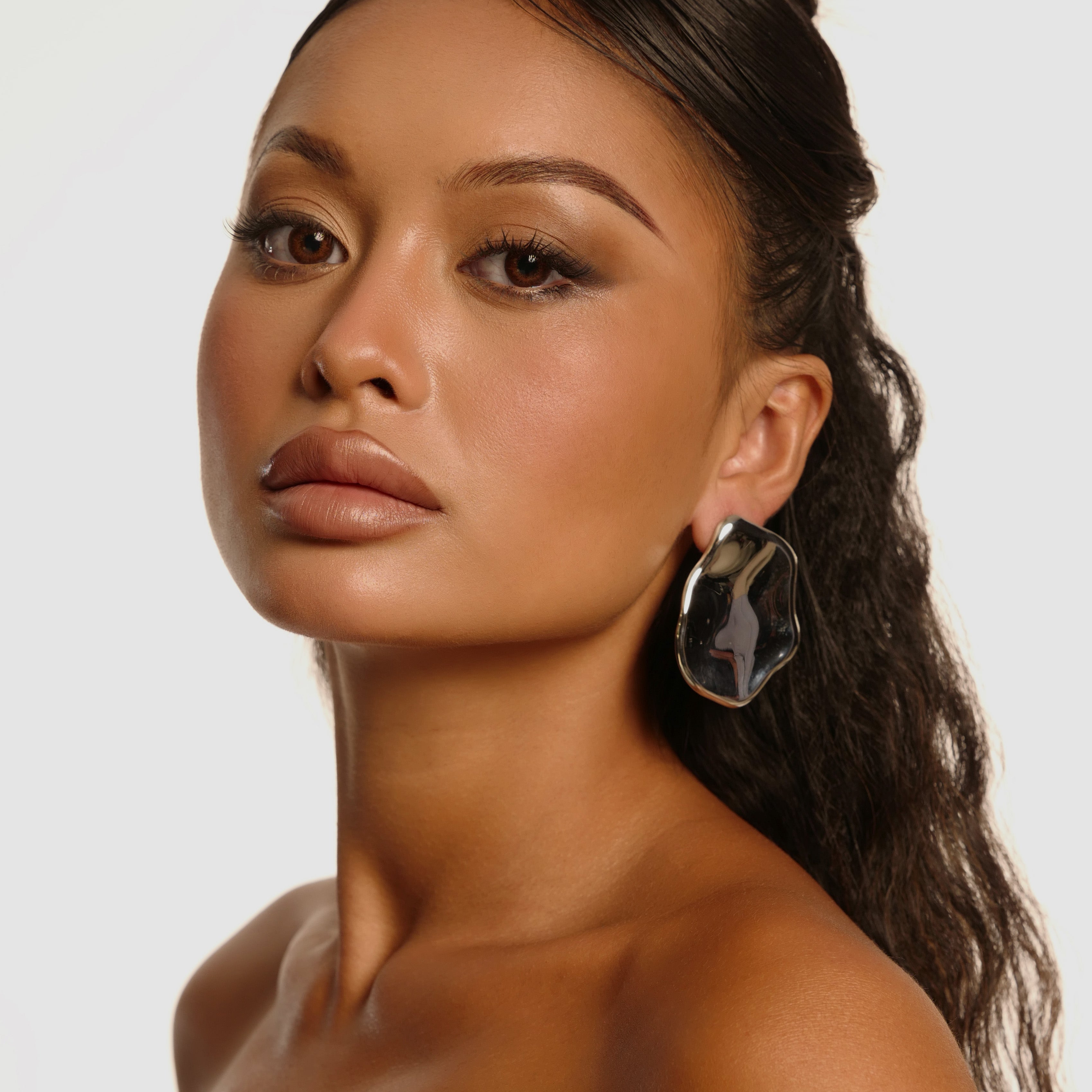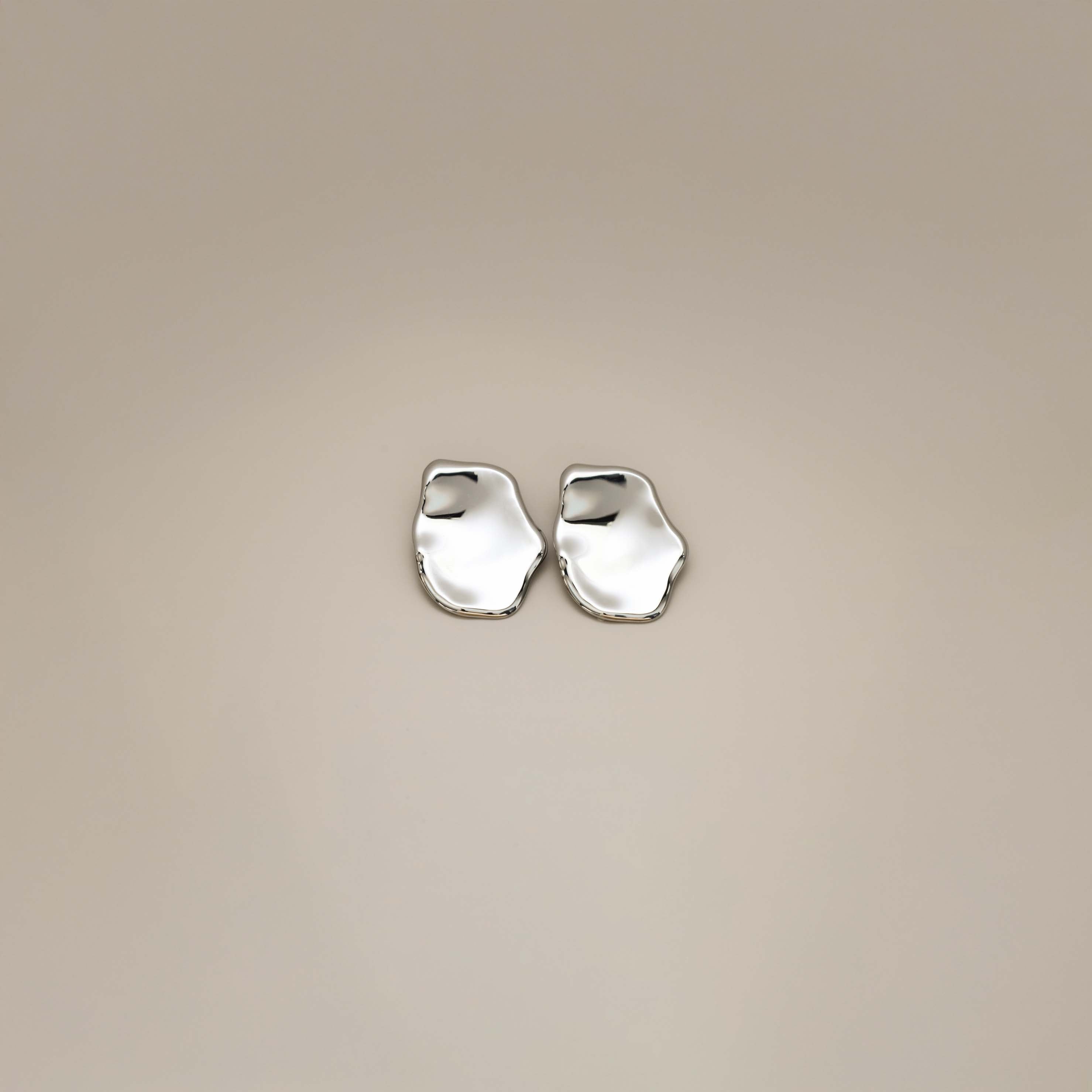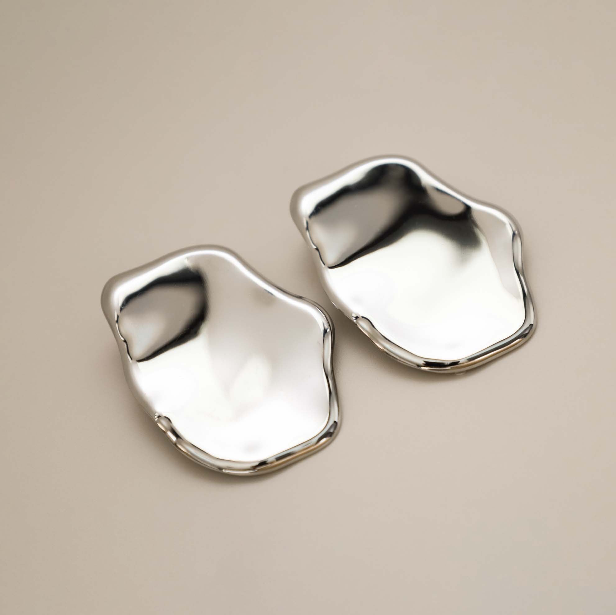 The Enaia Earrings are a silver plaque design with soft, melted edges and a shallow concave profile create a sculptural, high-impact silhouette. Generous in scale yet clean in detail, they frame the face with modern polish. These are the perfect statement earrings for the event season ahead.