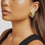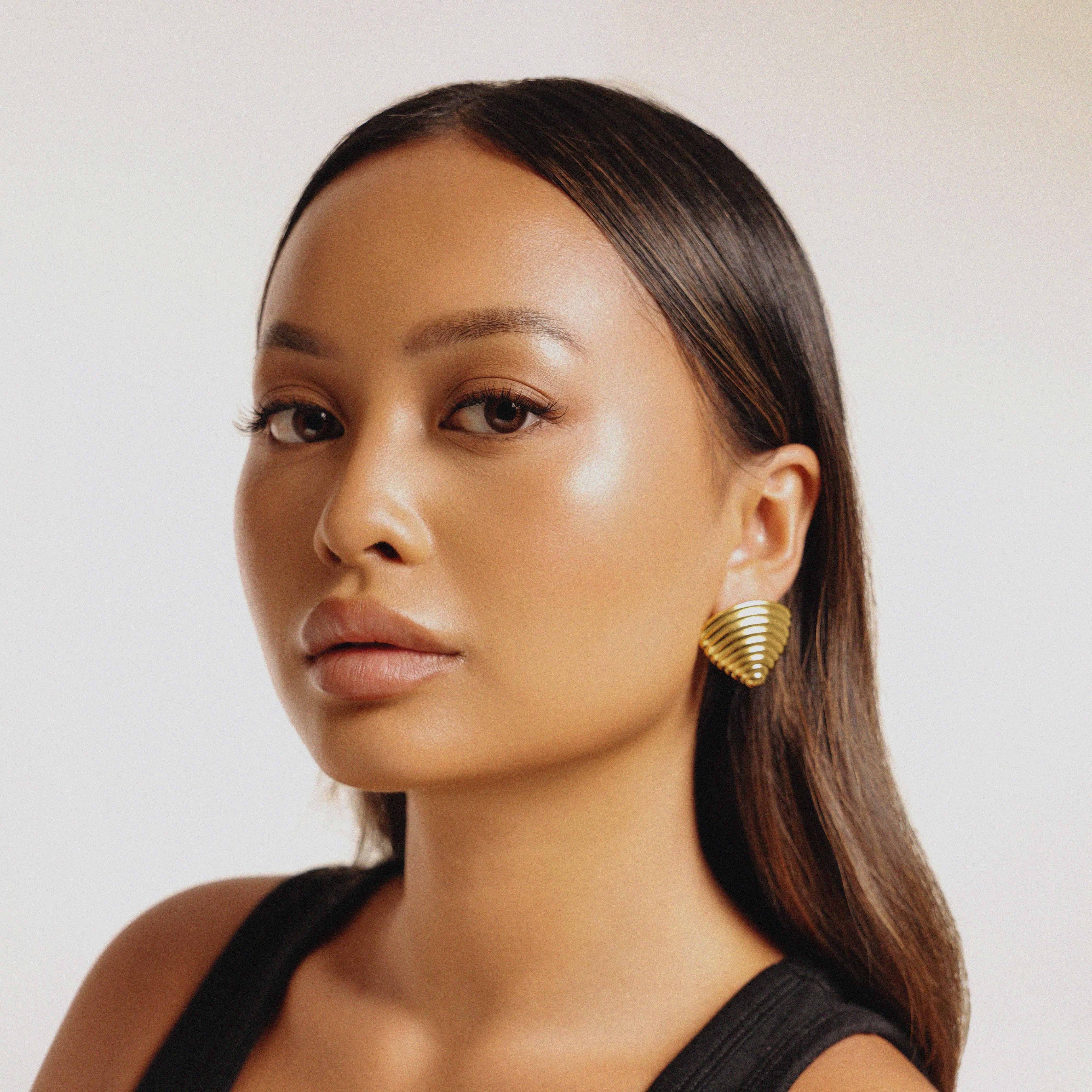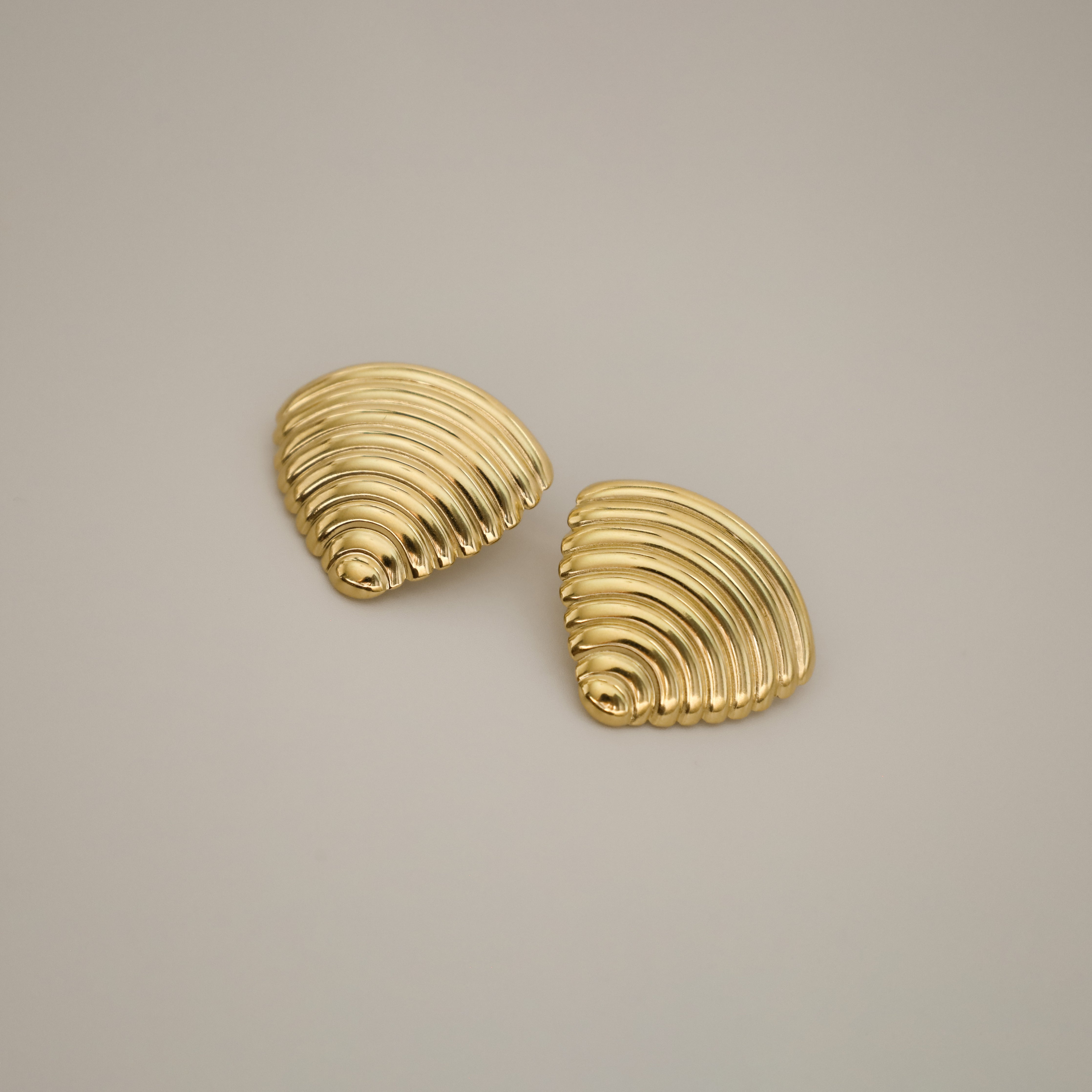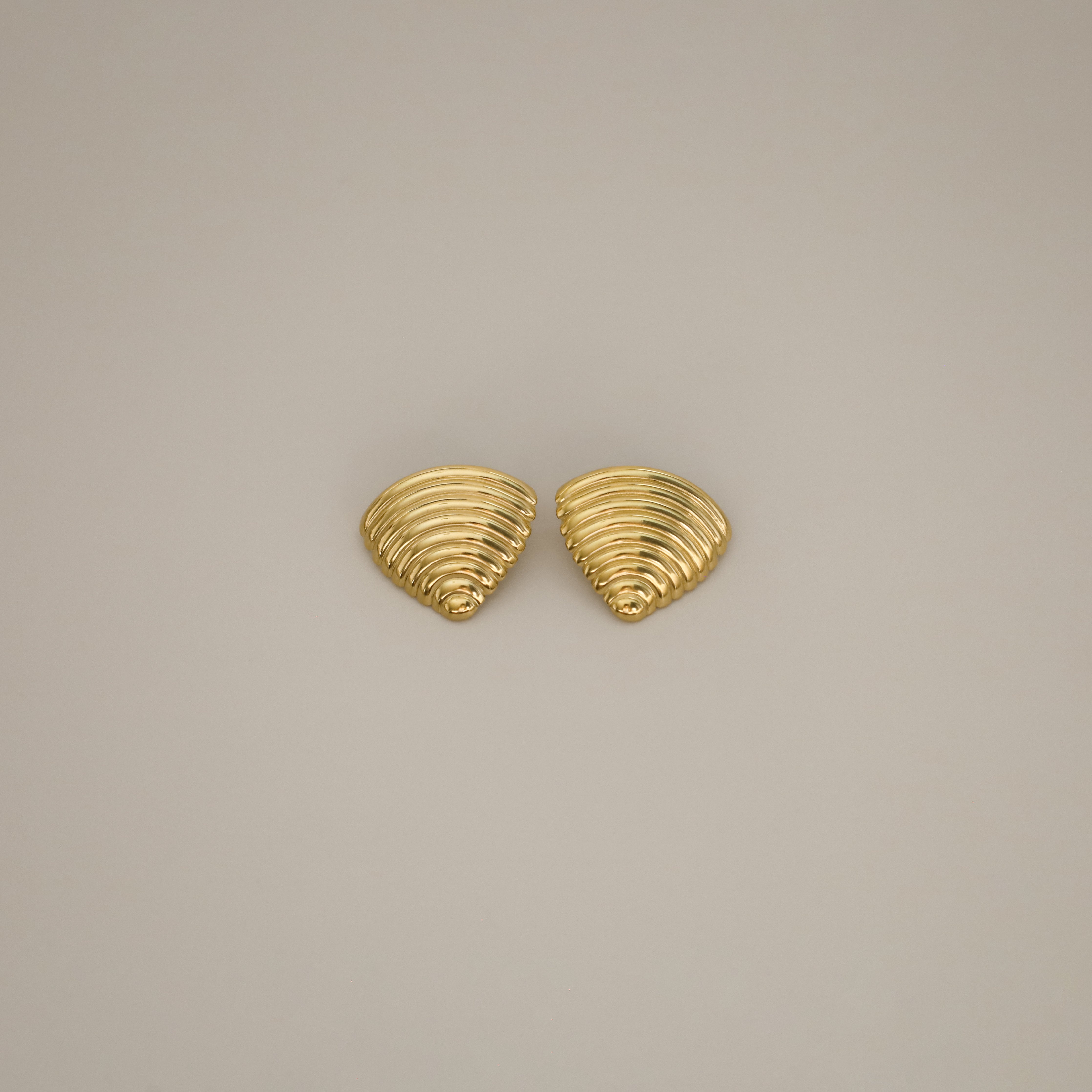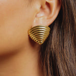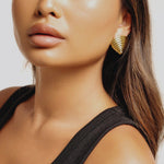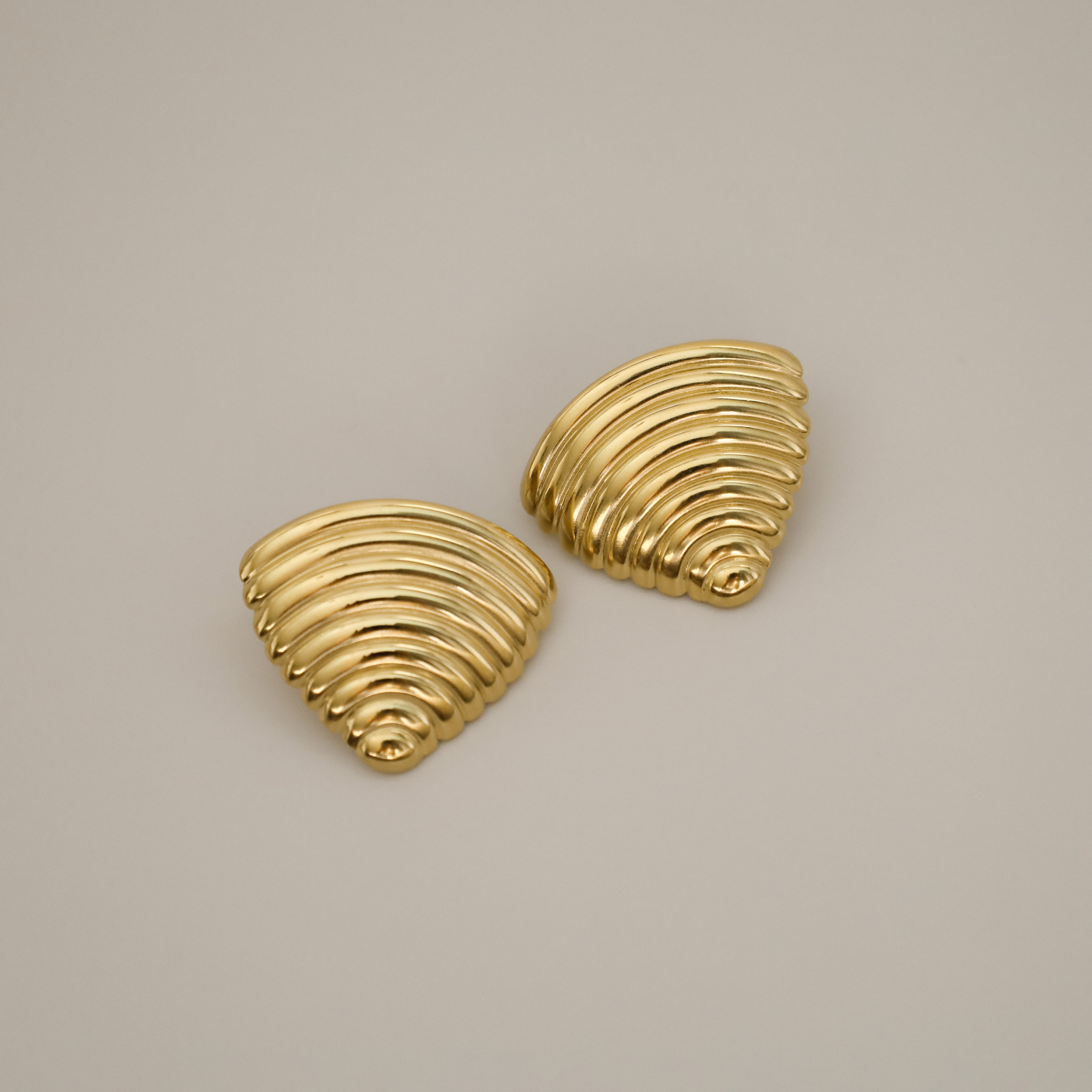 The Epes Earrings are triangular shaped earrings inspired by the natural beauty of seashells, featuring a layered design that mimics their curves. These are the perfect earrings to throw on when you want to elevate an outfit. A must have in a statement jewellery lovers collection.
