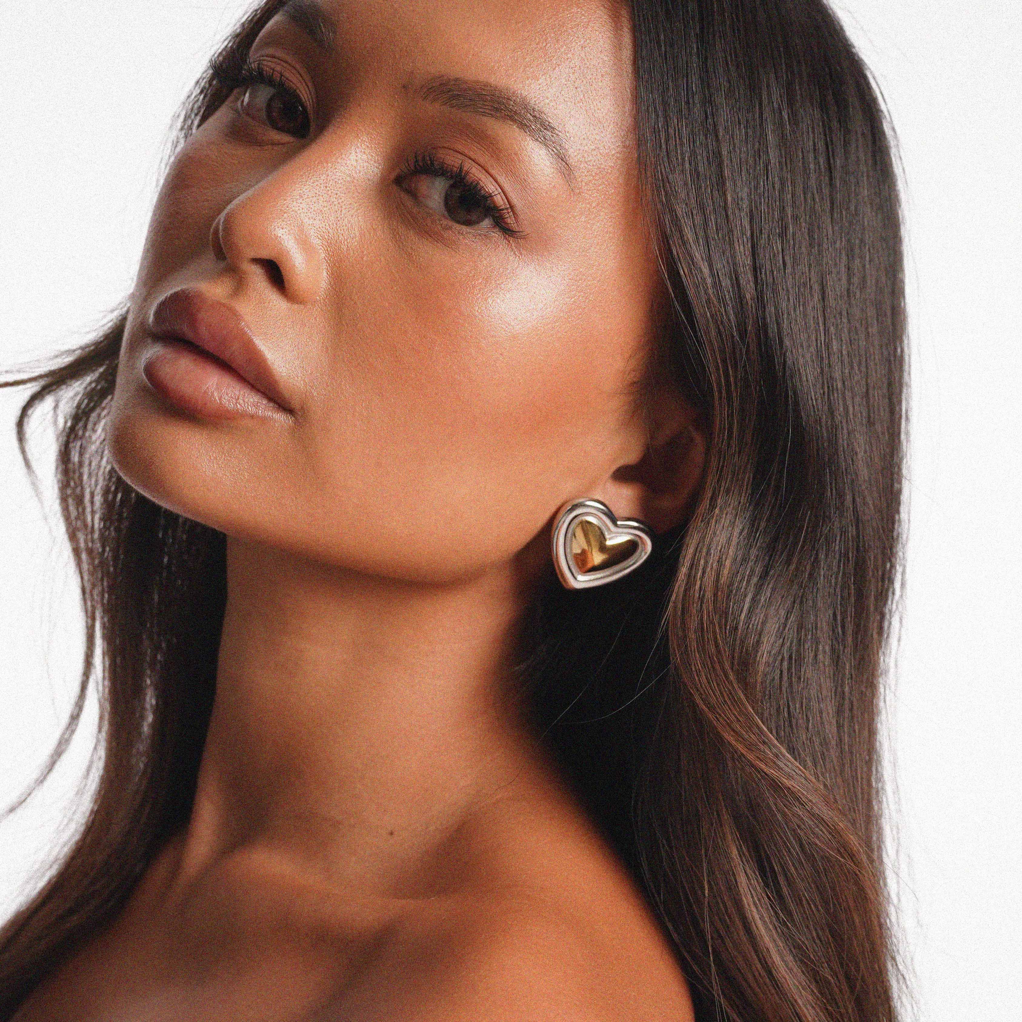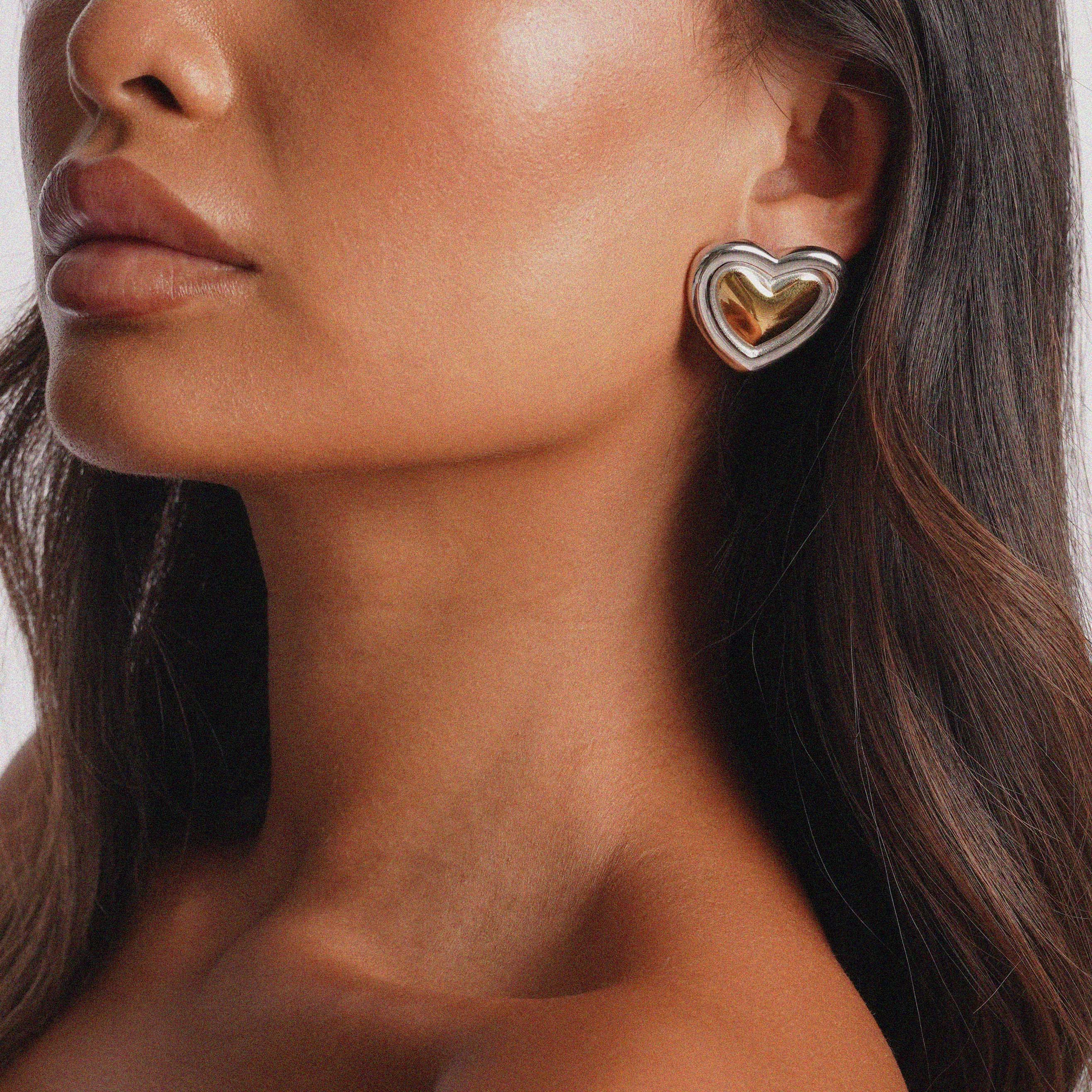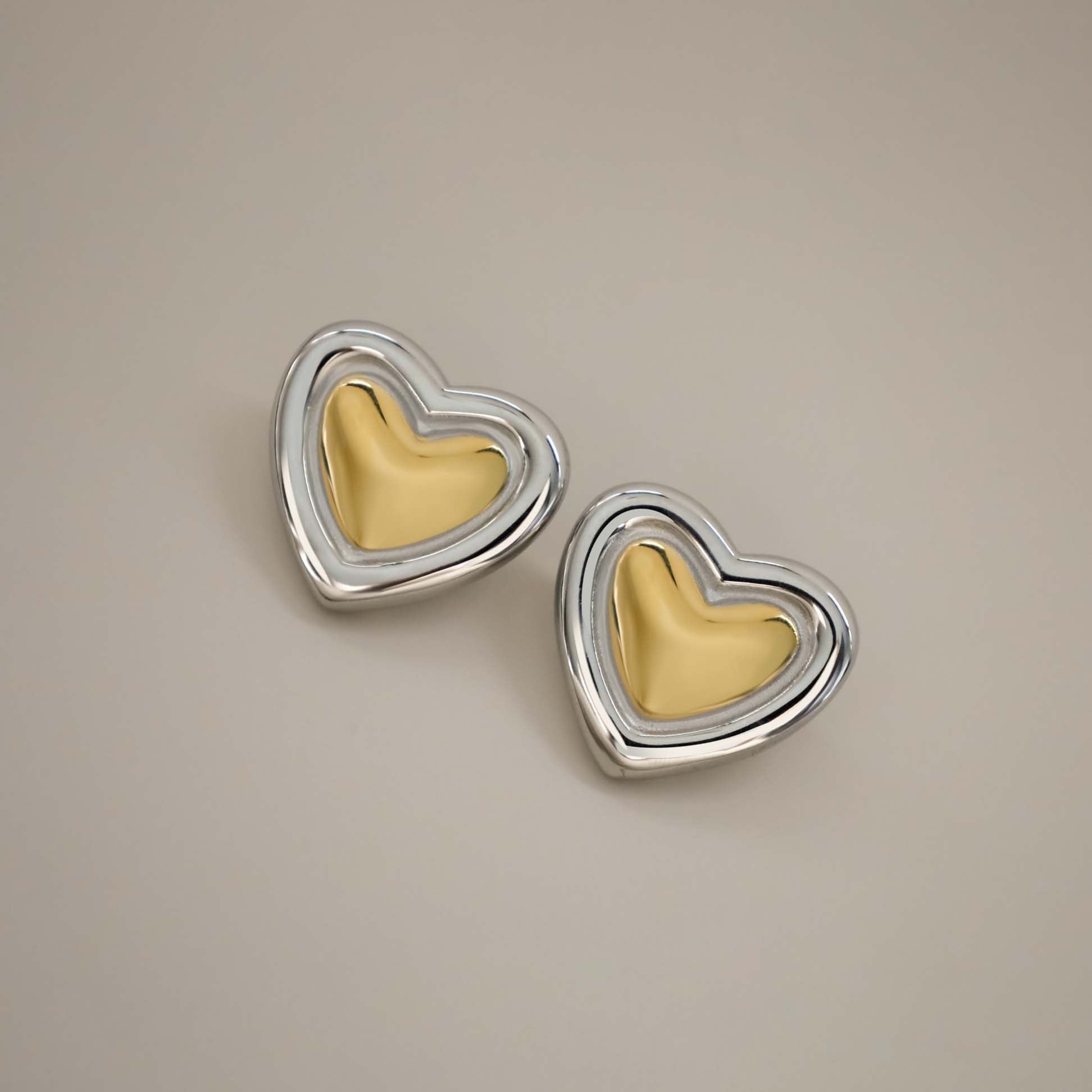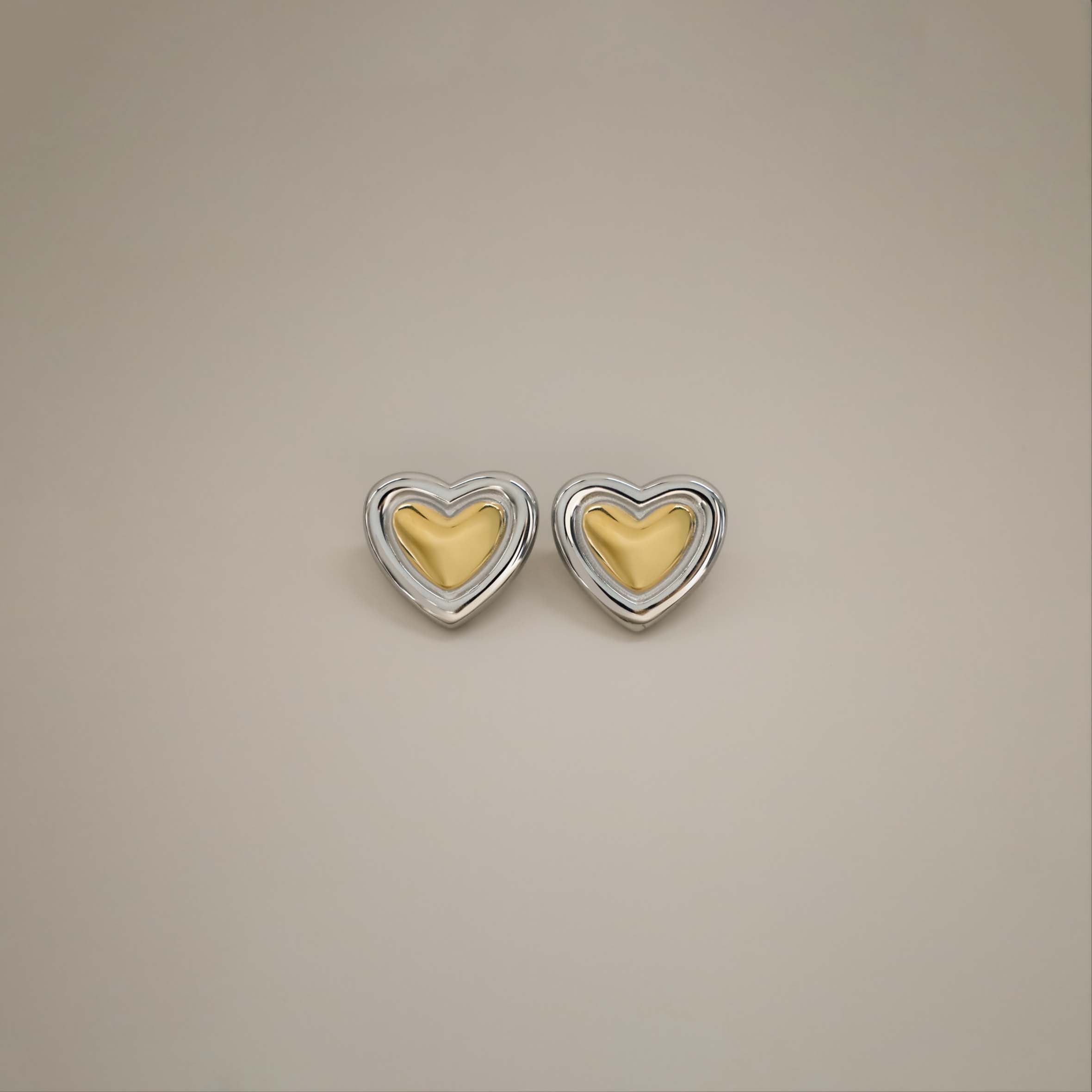 The Essavia Earrings are a simple yet striking combination of silver and gold tones. Featuring a gold heart-shaped design framed in a polished silver border, these earrings add contrast and depth. Designed for everyday wear or special occasions, they offer a refined look without being overcomplicated.