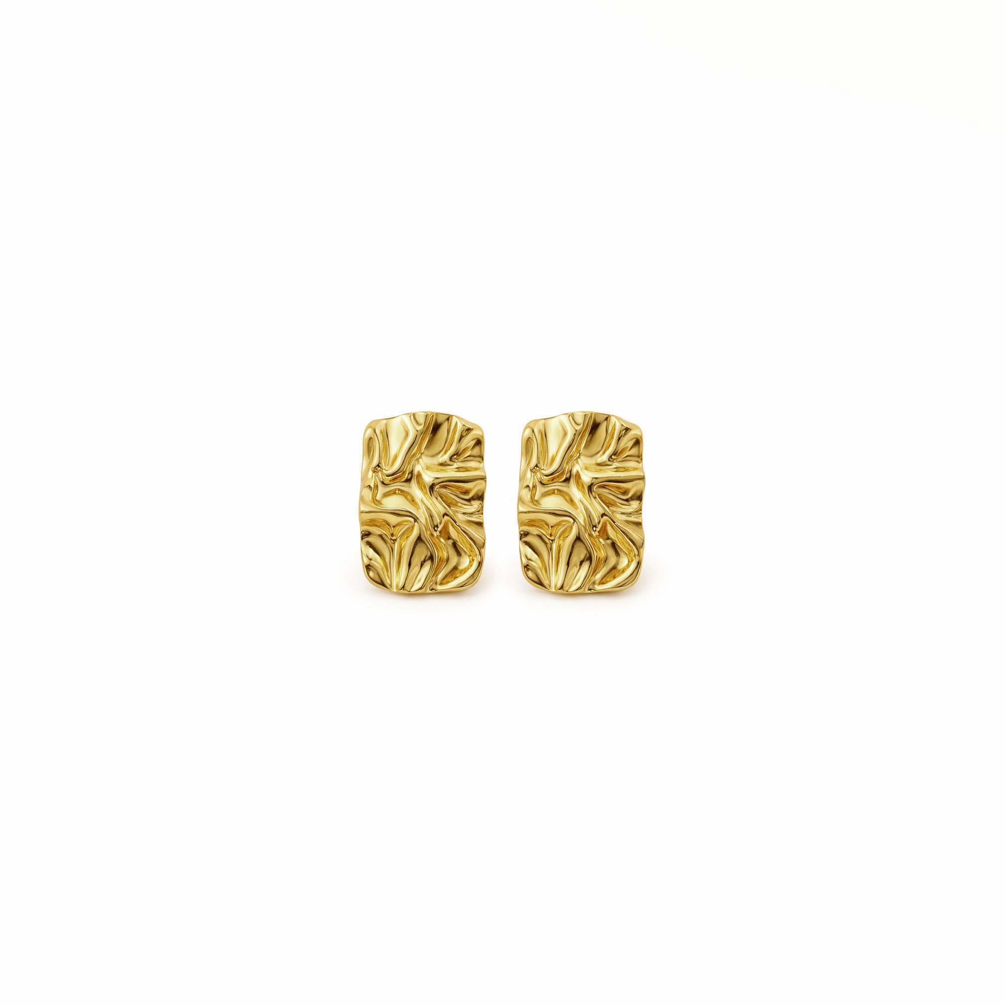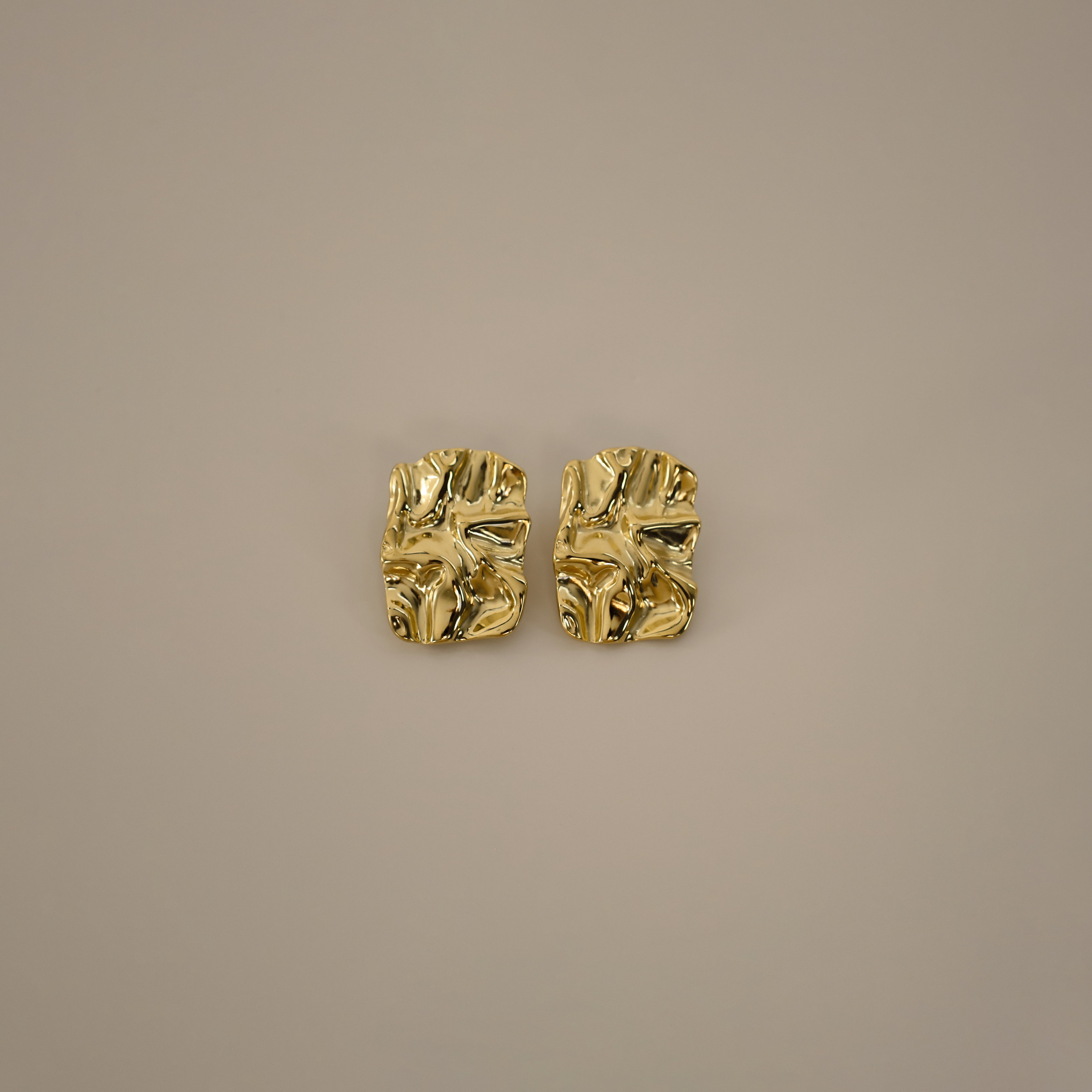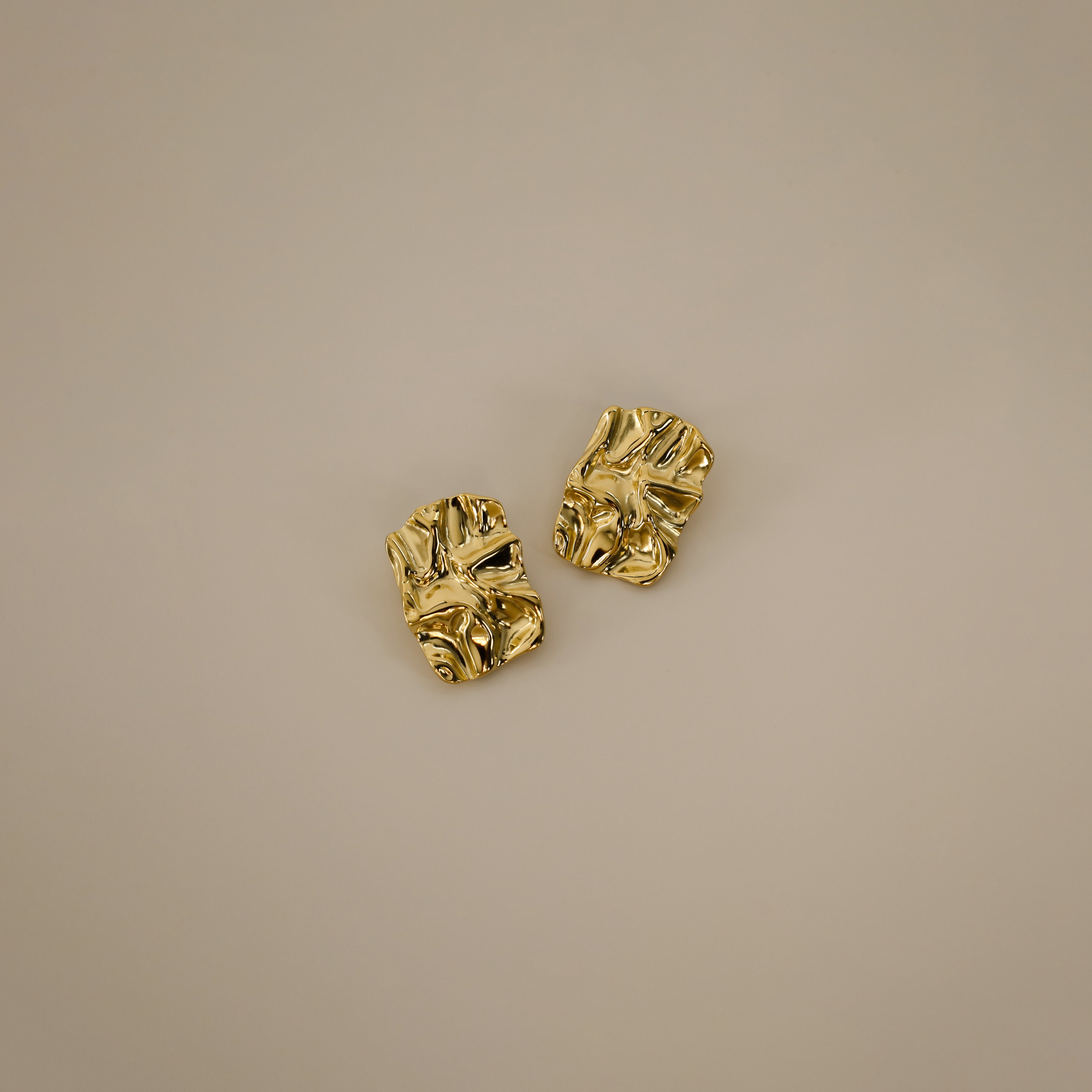 The Evaoi Earring is a stylish pair of rectangular earrings featuring an irregular hammered crinkle design. These earrings add a unique, textured element to any outfit, perfect for making a statement.