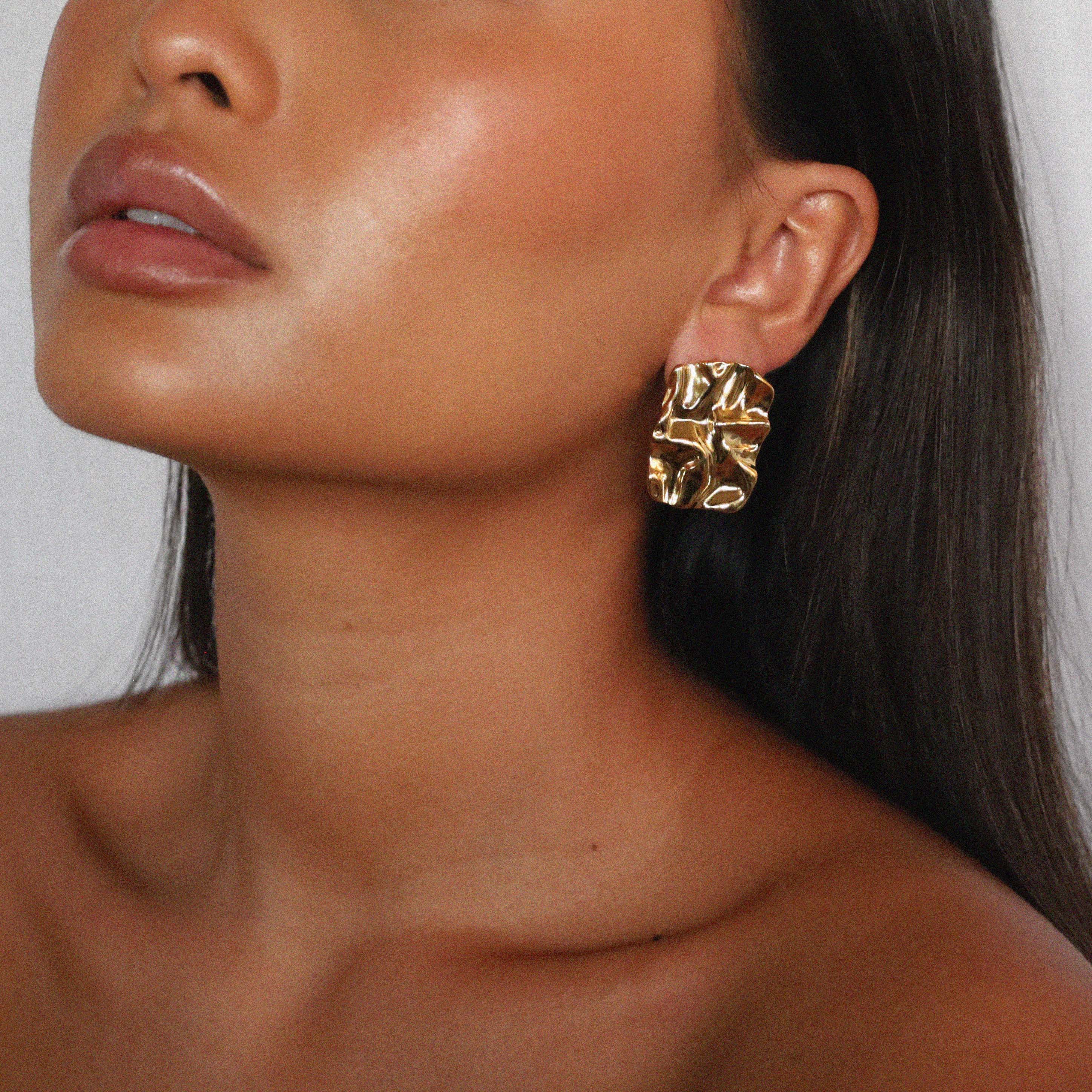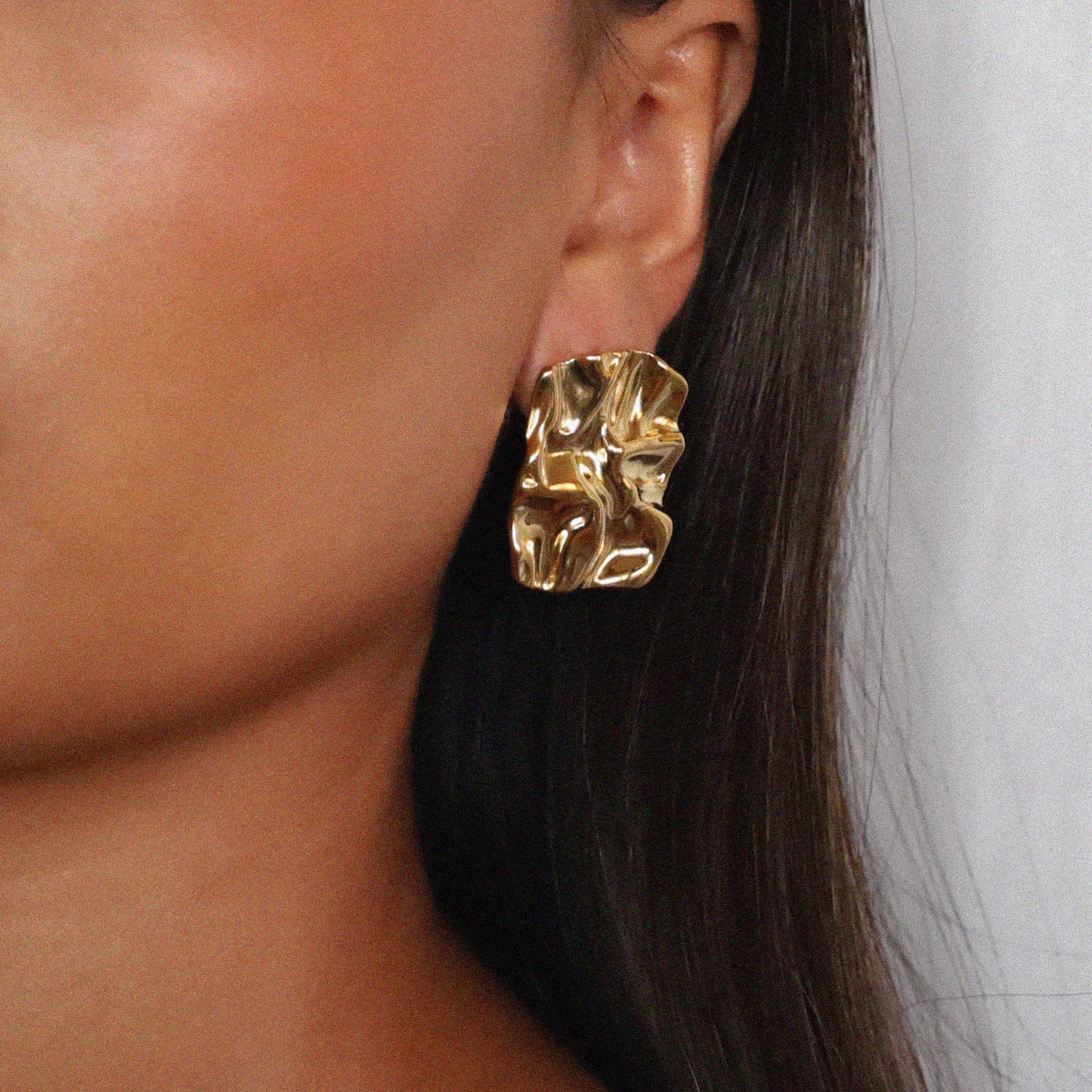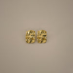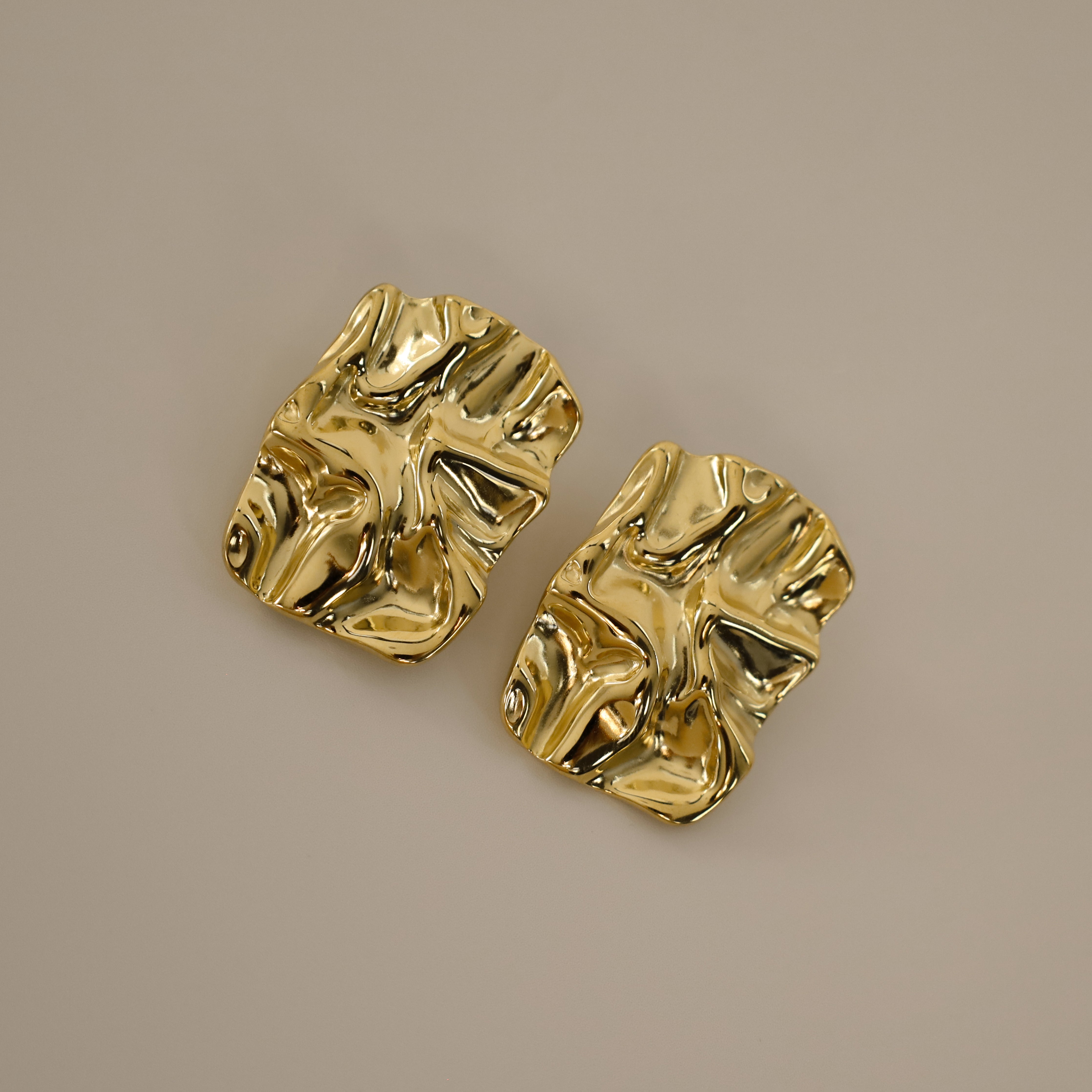 The Evaoi Earring is a stylish pair of rectangular earrings featuring an irregular hammered crinkle design. These earrings add a unique, textured element to any outfit, perfect for making a statement.