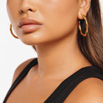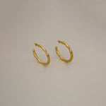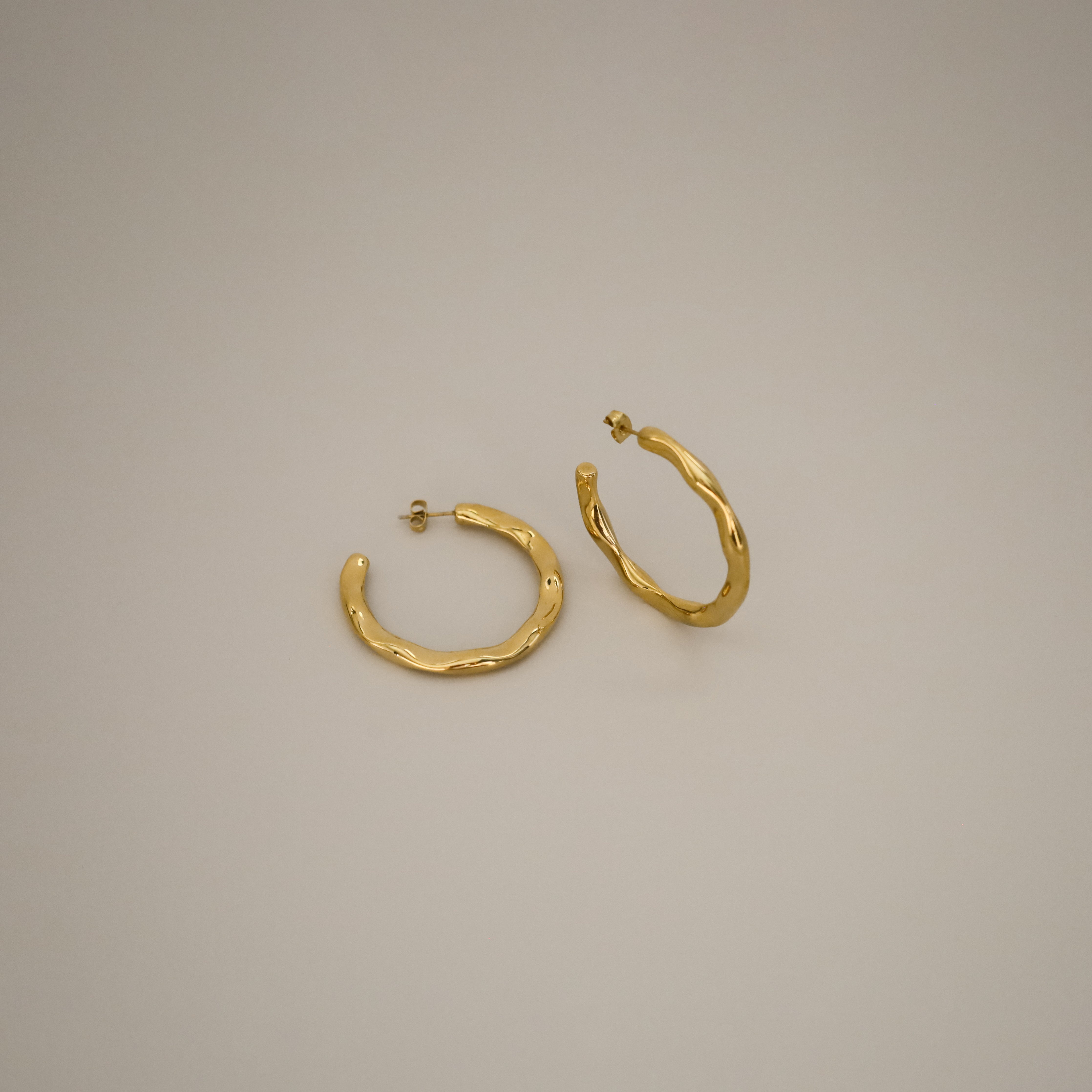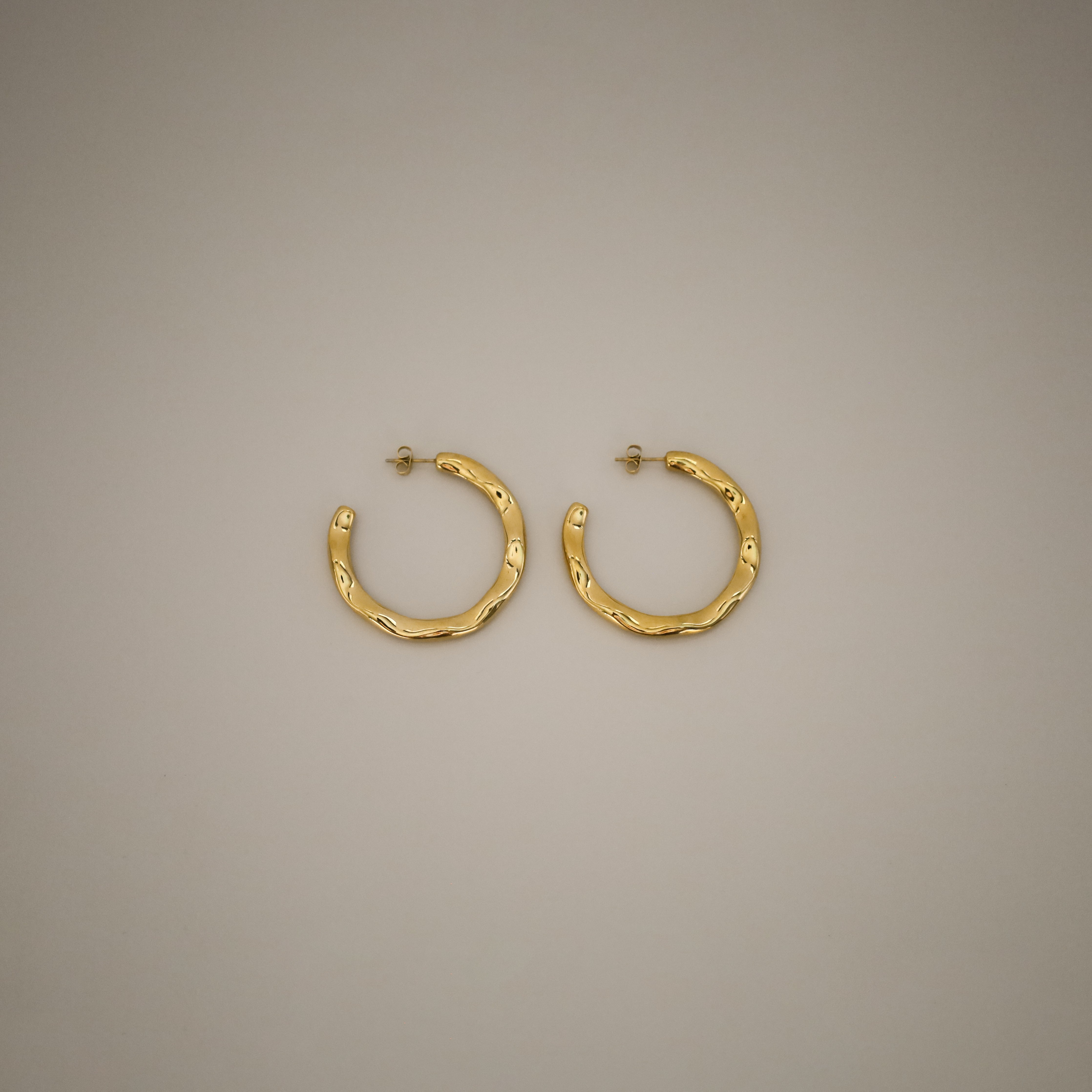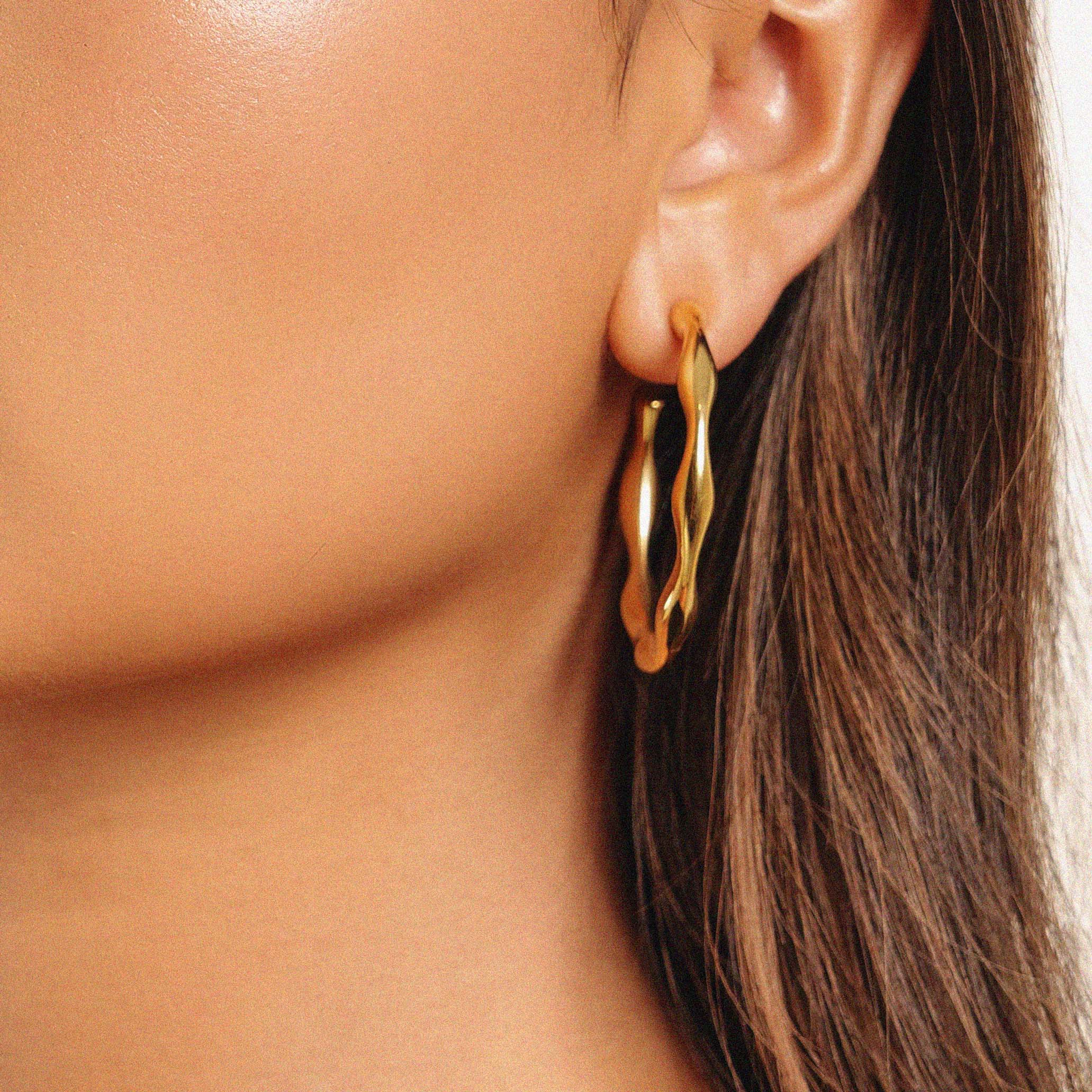 The Ezalla Earring is a large hoop style earring with a modern twist on the classic hoop with its subtle, textured & wavy design. Its minimalist style makes it easy to wear daily or dress up for an evening out. Simple, versatile, and effortlessly chic. A must have for those who love an elevated hoop.