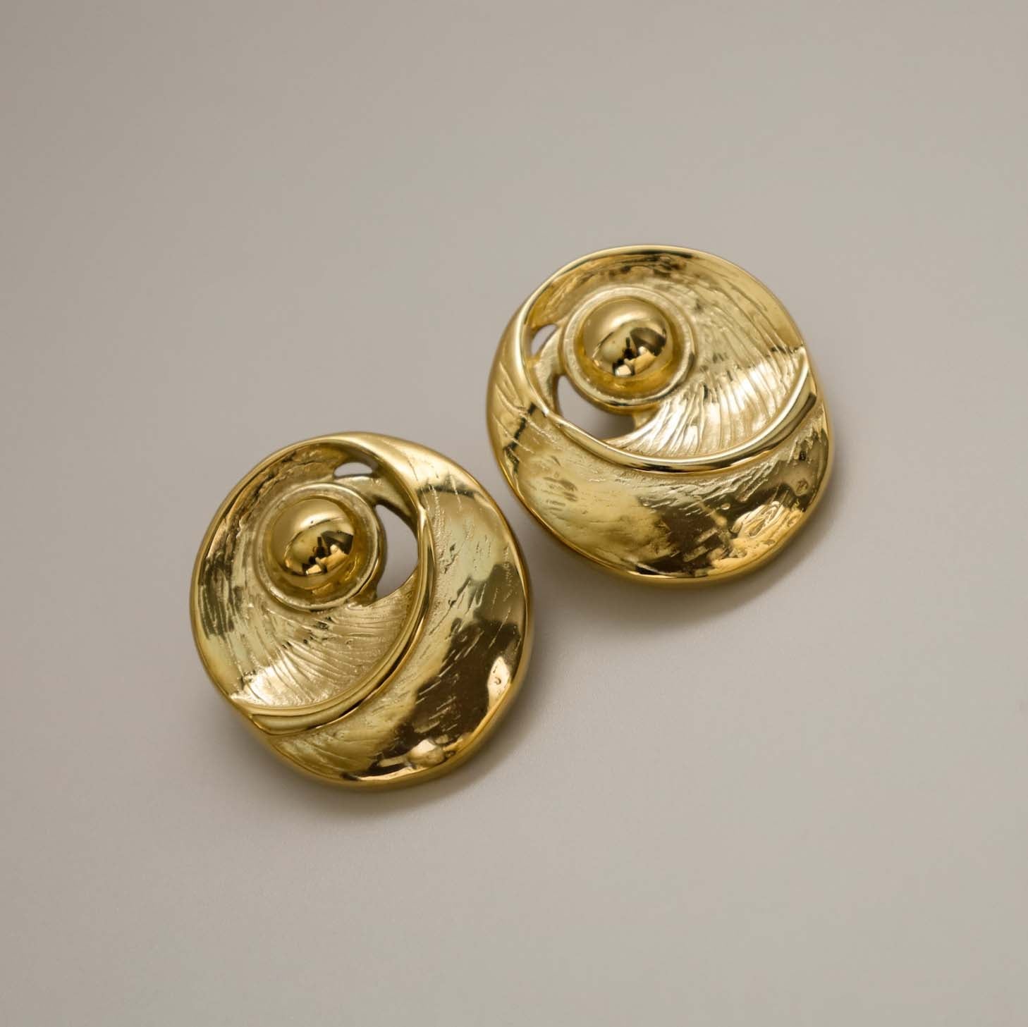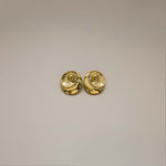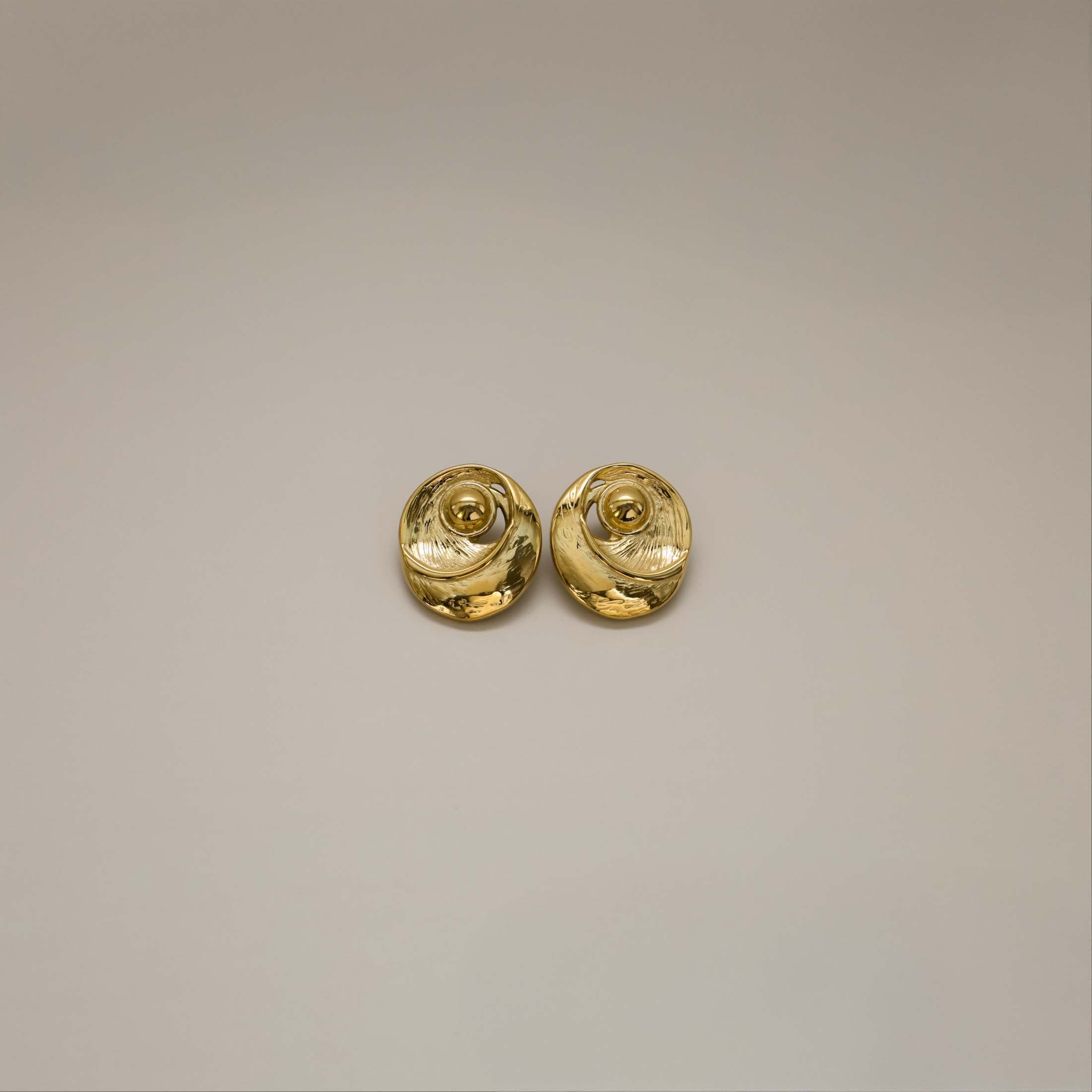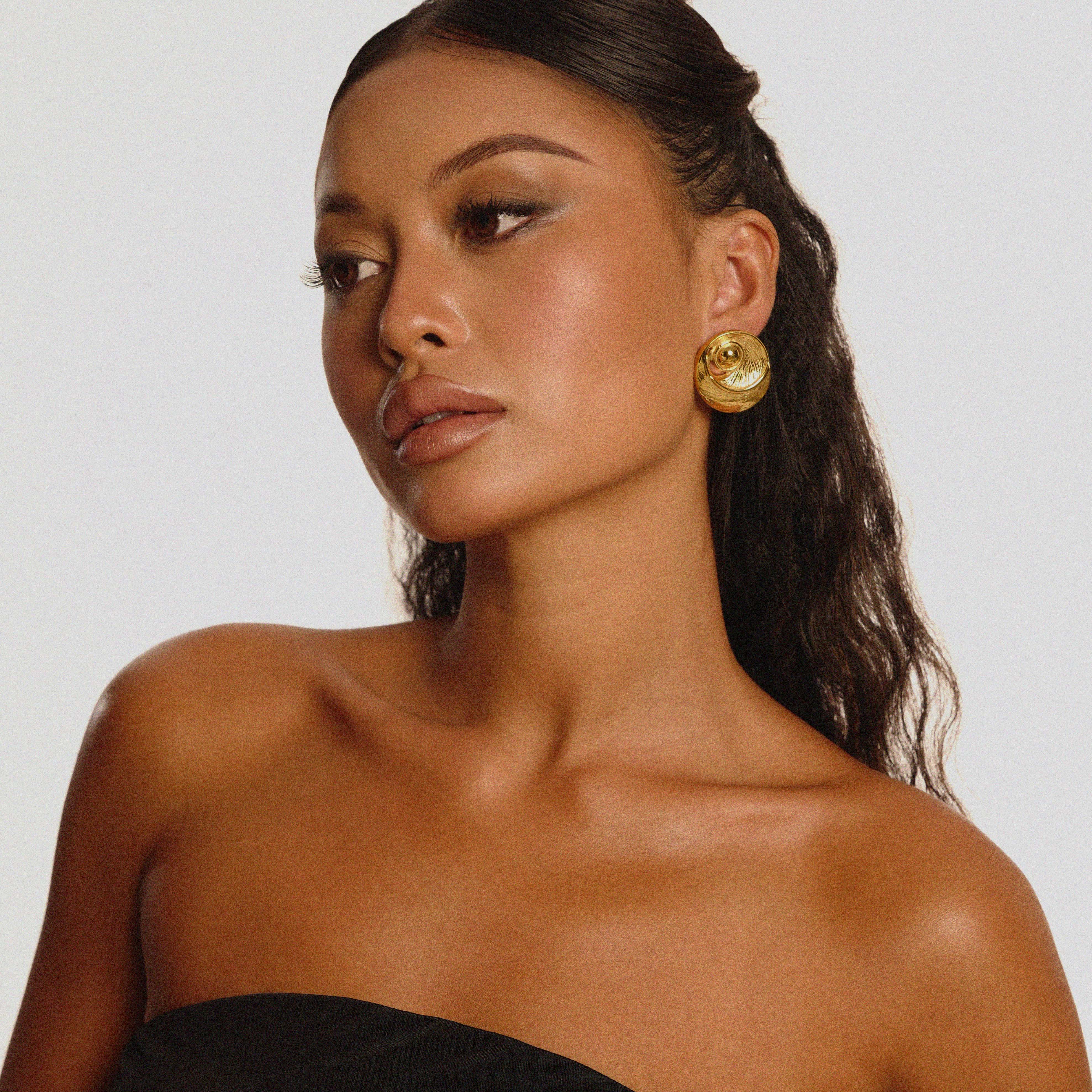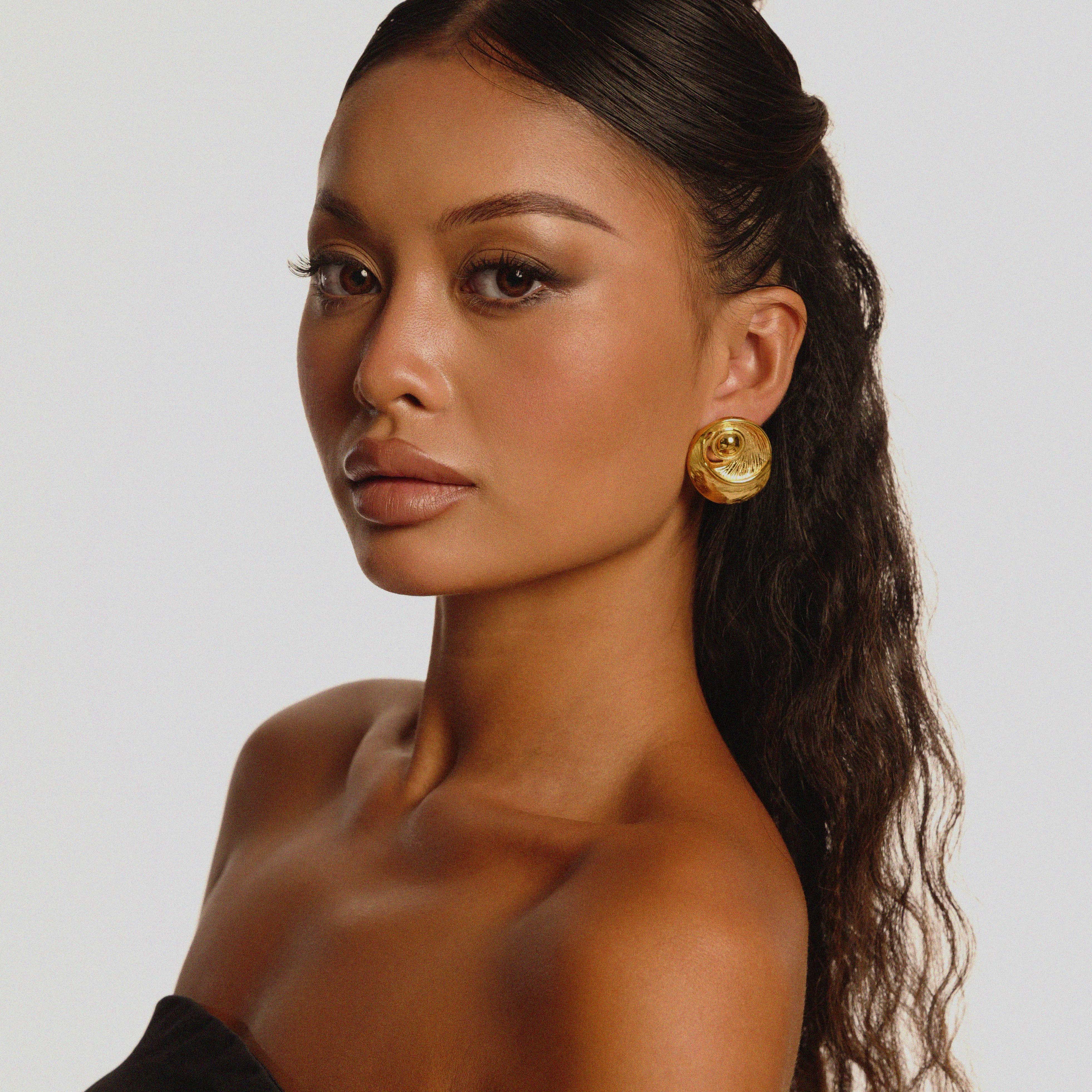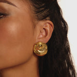 The Ezelle Earrings are bold, round studs with a sculptural, spiral-like silhouette. A raised central dome sits inside sweeping crescent layers that create subtle negative space and gentle texture around the edge, along with small cut outs throughout. They frame the ear beautifully and add instant presence to casual outfits and evening looks alike.