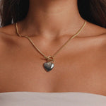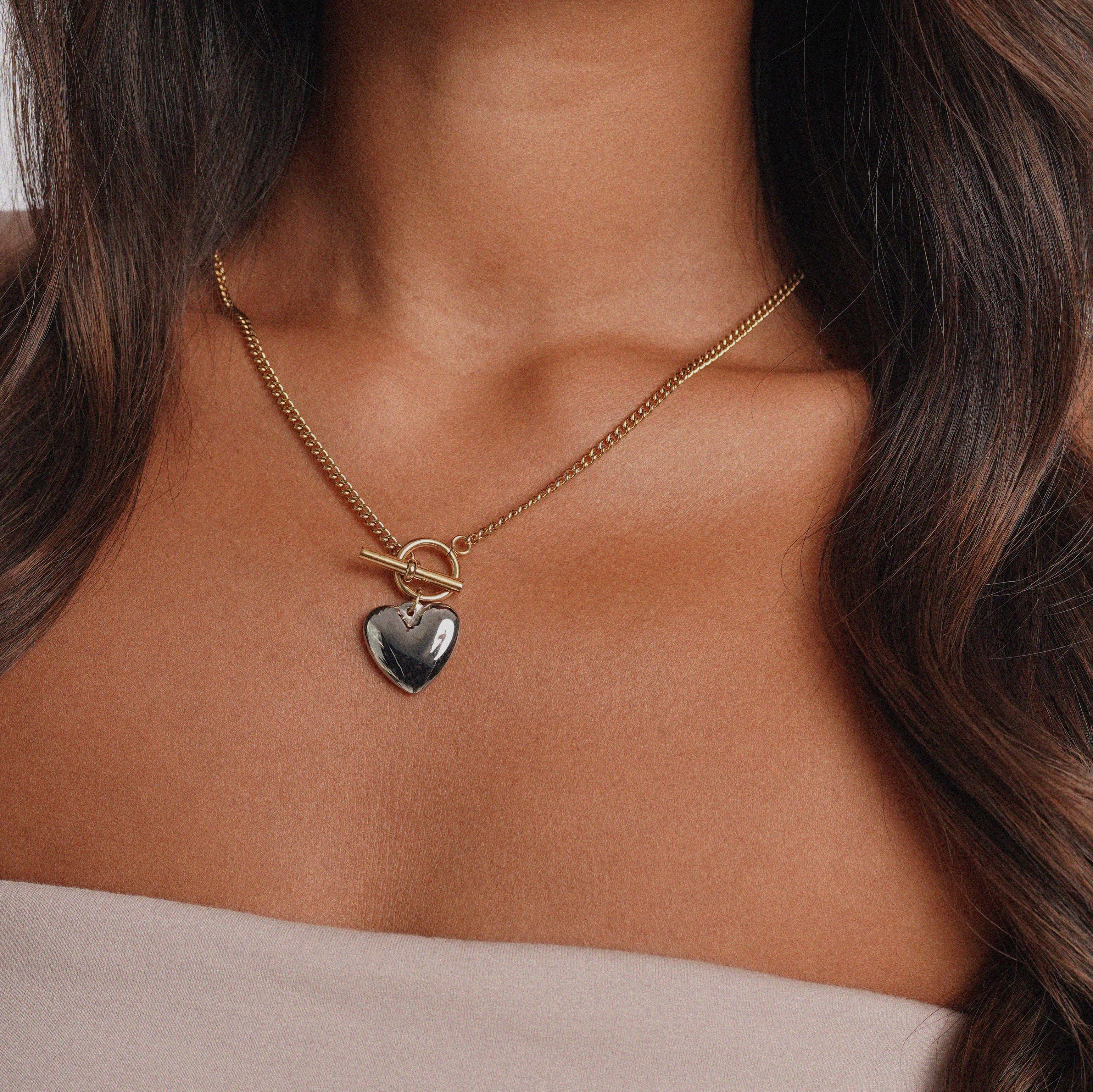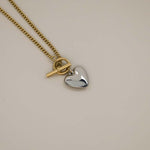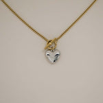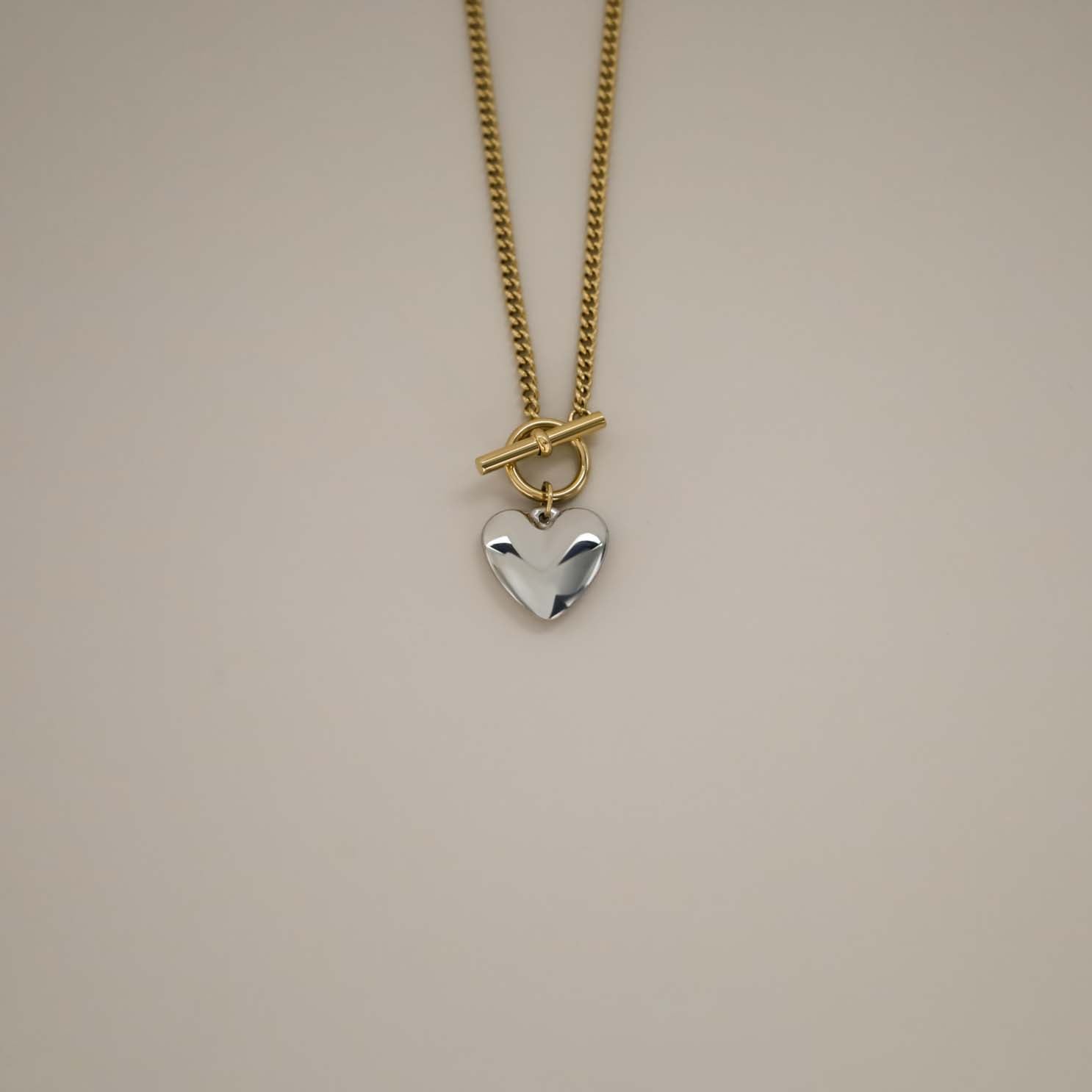 The Nessara Necklace is a bold take on a classic heart pendant. Featuring a polished puffy silver heart suspended from a structured gold curb chain, it is fastened with a distinctive toggle clasp, which also adds an element of design. Designed for easy wear, this necklace combines contrasting metals for a striking finish. Wear it alone or layer it with other pieces.