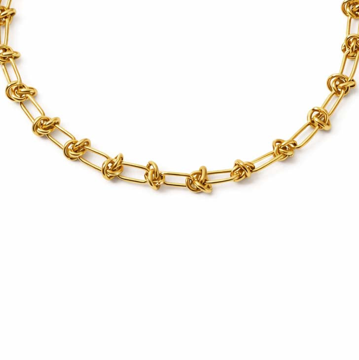 The Nile Gold Necklace is a chunky gold paperclip link chain with knotted connections between each rectangular link, creating a design that is both bold and intricately detailed. The knot junctions give the chain a tactile, three dimensional quality that draws the eye along the neckline. It's the kind of gold necklace that people notice and ask about immediately. At over 28 grams it has a genuinely substantial, luxurious weight that makes it feel like an investment piece.