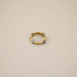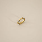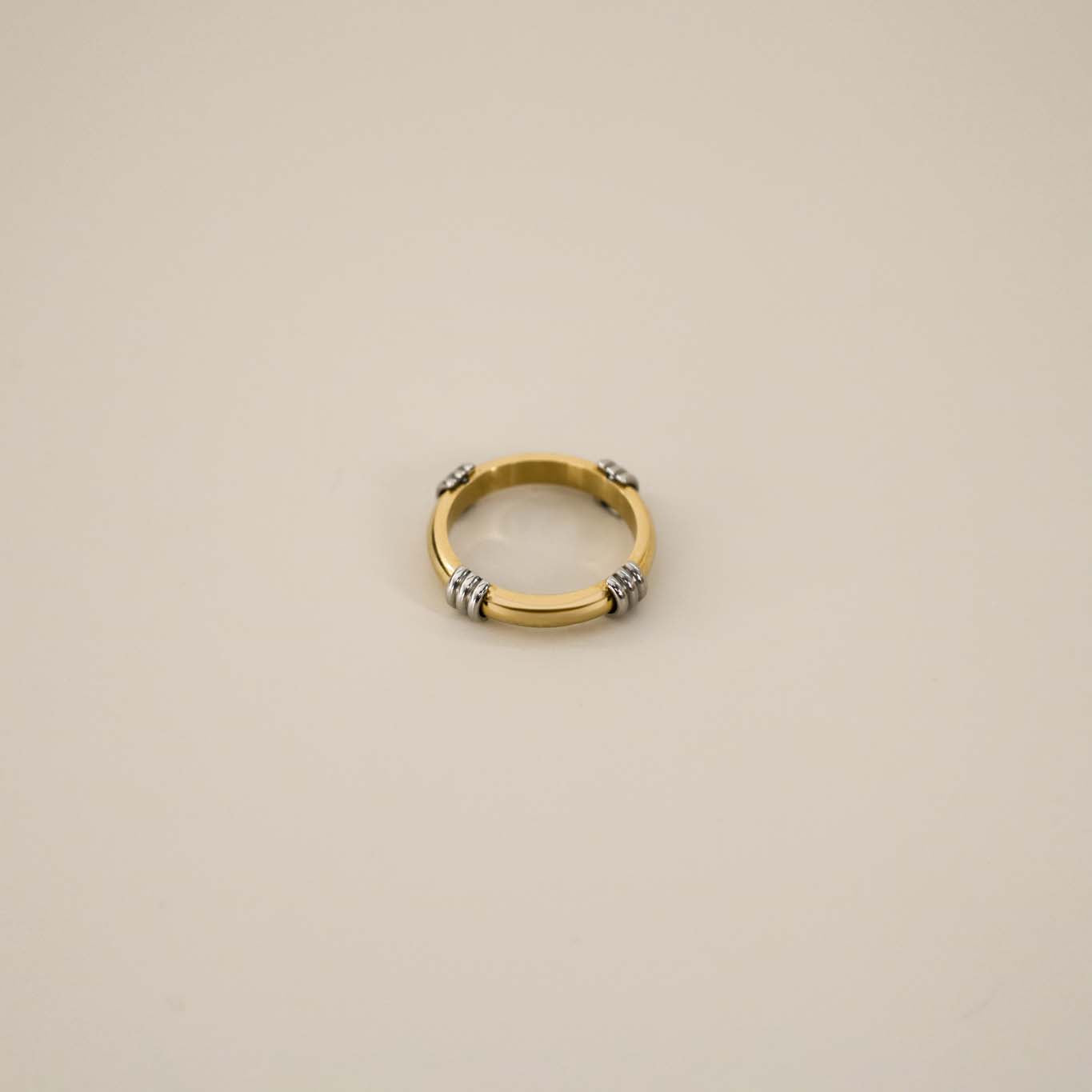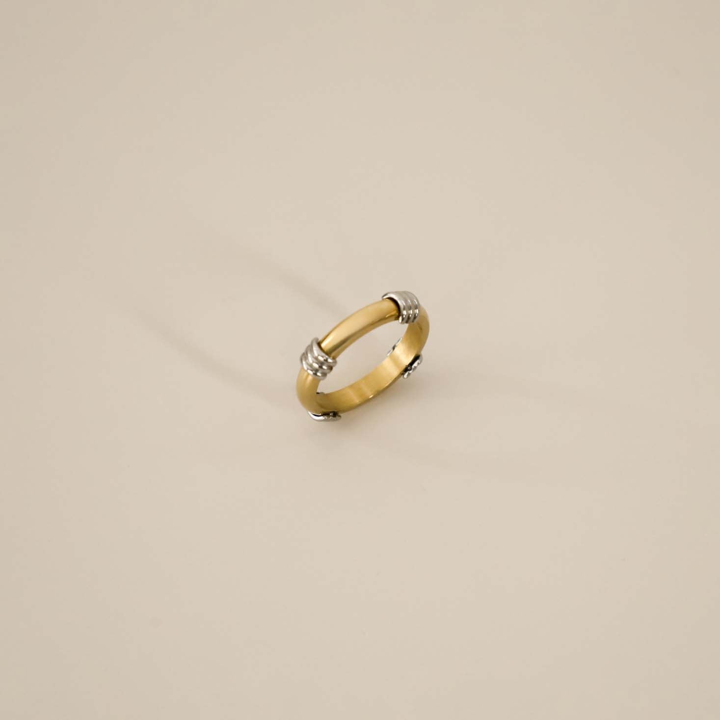 The Rione Ring features a gold-toned band accented with four evenly spaced silver wraps for a structured, modern look. The contrast in finishes adds texture while keeping the design clean and minimal. Lightweight and easy to wear, the Rione Ring stands out on its own or pairs well with other bands.