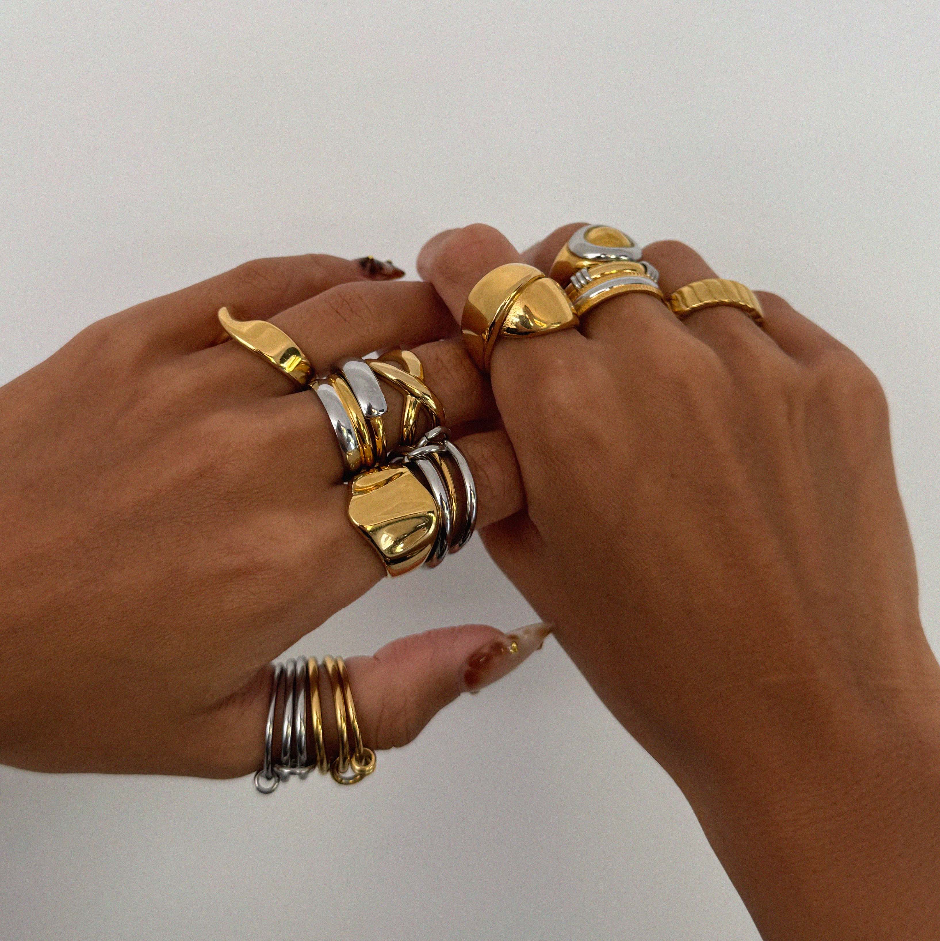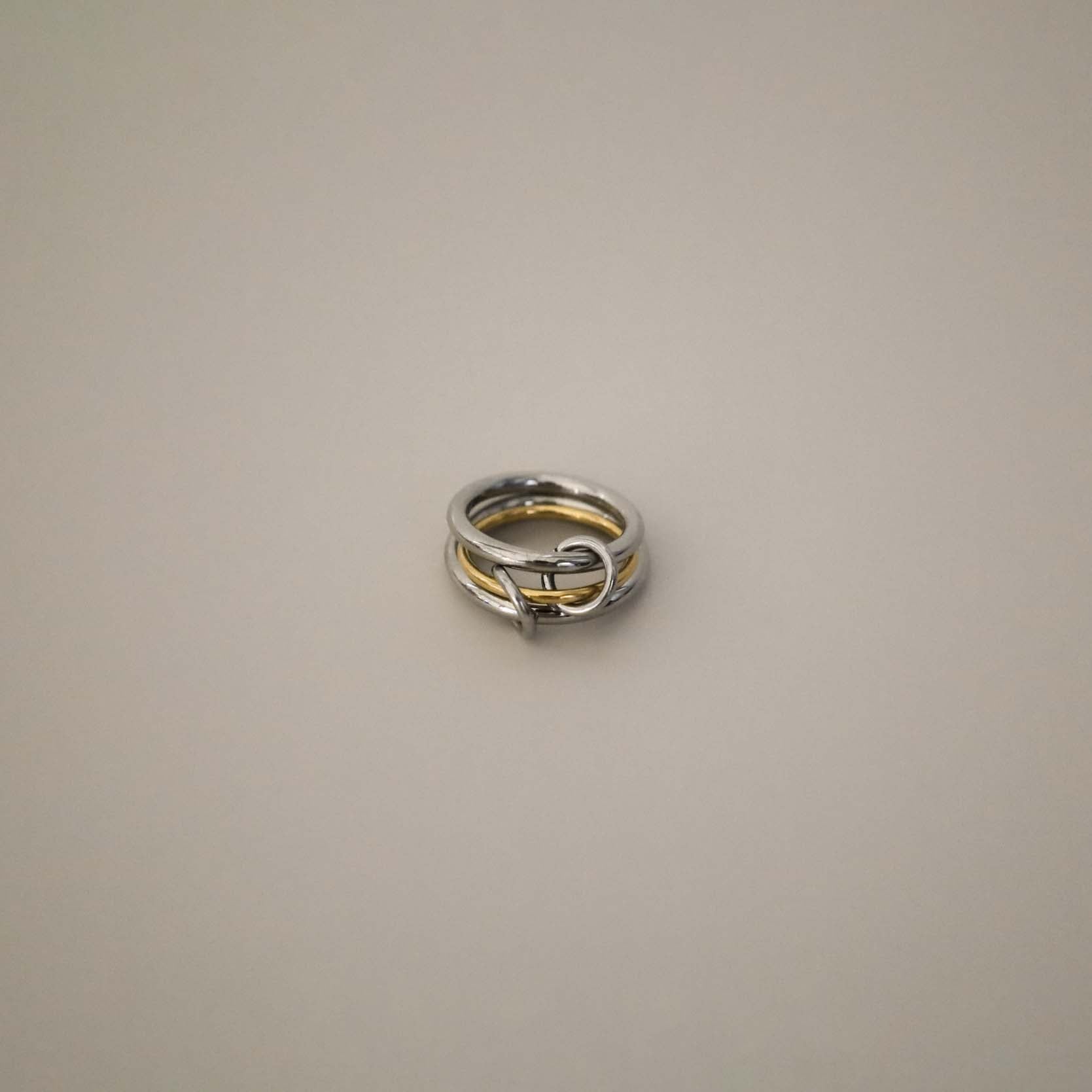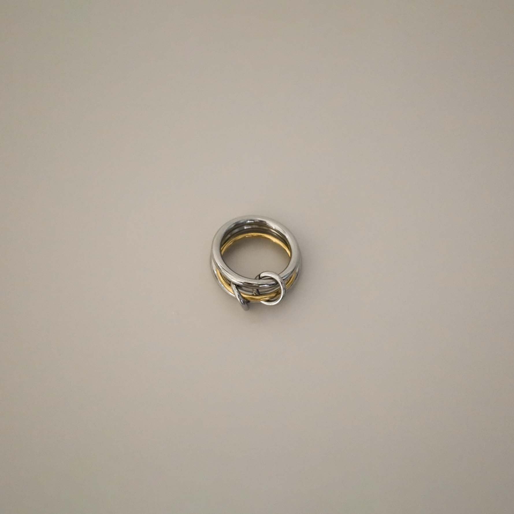 The Rivell Mixed Ring is a sculptural weighty piece crafted from three interlocked bands in contrasting silver and gold tones. The two outer silver bands are slightly thicker, framing the slimmer gold band that sits at the centre. Connected by small jump rings, the design gives the illusion of a stacked set while offering depth, dimension, and a refined edge.
